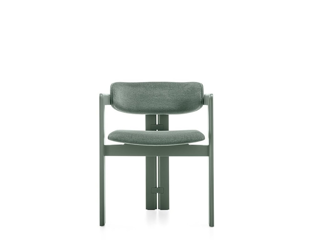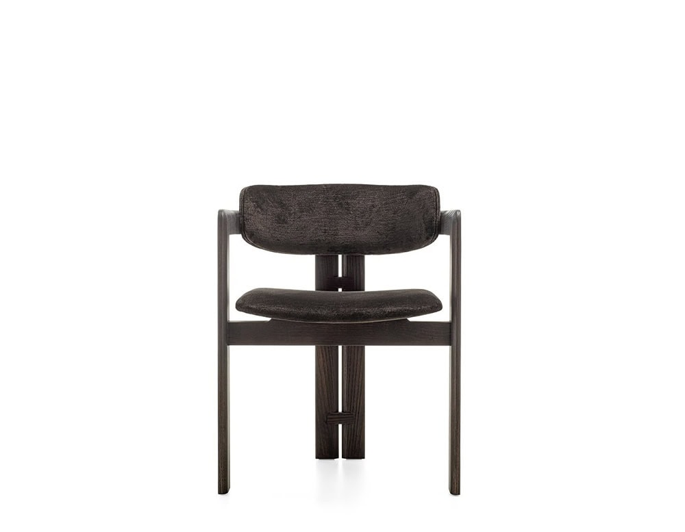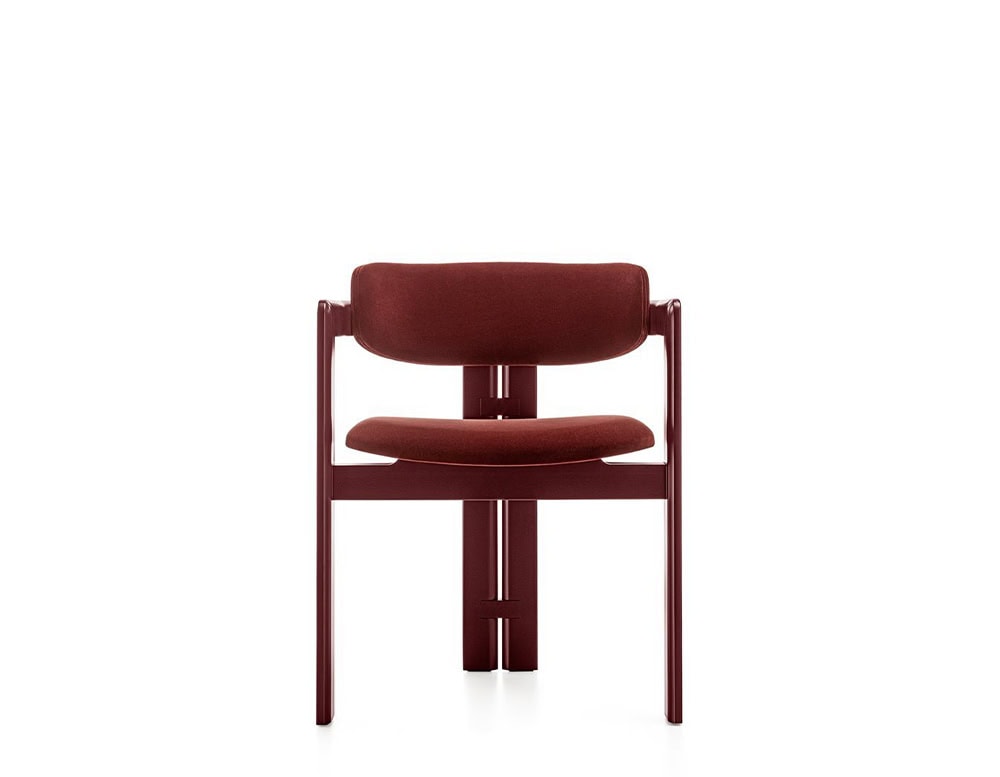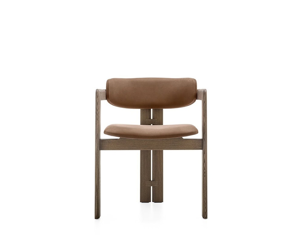 Armchair with solid curved wooden structure. Available in natural ash or black stained open pore, tobacco stained open pore, white stained open pore or grey smoke stained open pore ash. NEW Available in clay stained open pore, wengé stained open pore or cinder stained open pore ash. Also available opaque lacquered closed pore beech version in the colours Rosa Jaipur, Verde Provenza, Bianco Camargue and Bordeaux Etruria. Seat and backrest with internal structure in wood and by-products with padding in non-deformable foam polyurethane in different densities. Covered by fabric or leather as per samples. Not removable cover.
