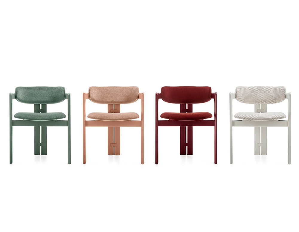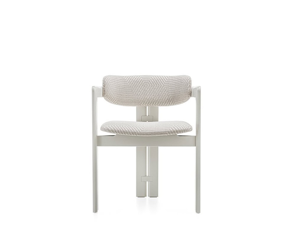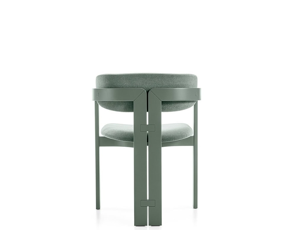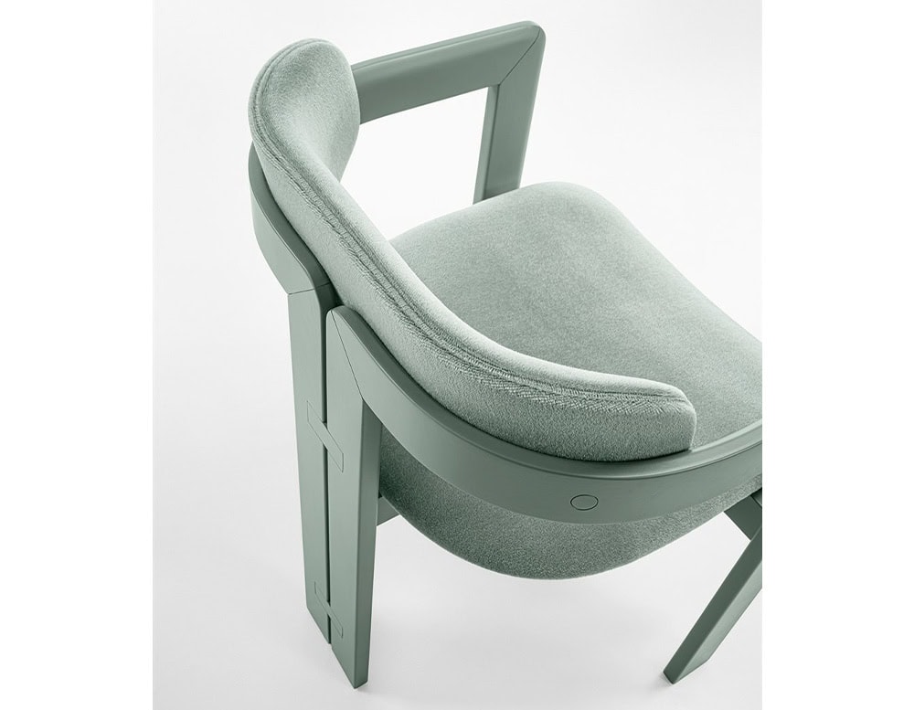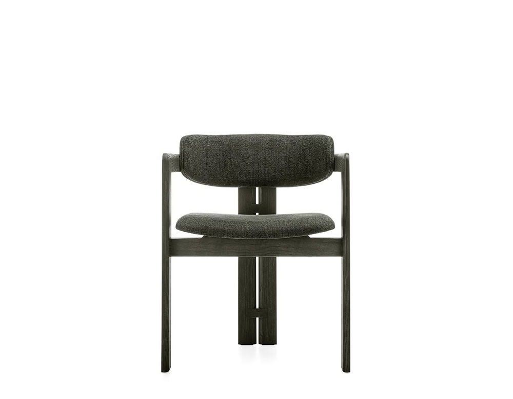 Armchair with solid curved wooden structure. Available in natural ash or black stained open pore, tobacco stained open pore, white stained open pore or grey smoke stained open pore ash. NEW Available in clay stained open pore, wengé stained open pore or cinder stained open pore ash. Also available opaque lacquered closed pore beech version in the colours Rosa Jaipur, Verde Provenza, Bianco Camargue and Bordeaux Etruria. Seat and backrest with internal structure in wood and by-products with padding in non-deformable foam polyurethane in different densities. Covered by fabric or leather as per samples. Not removable cover.
