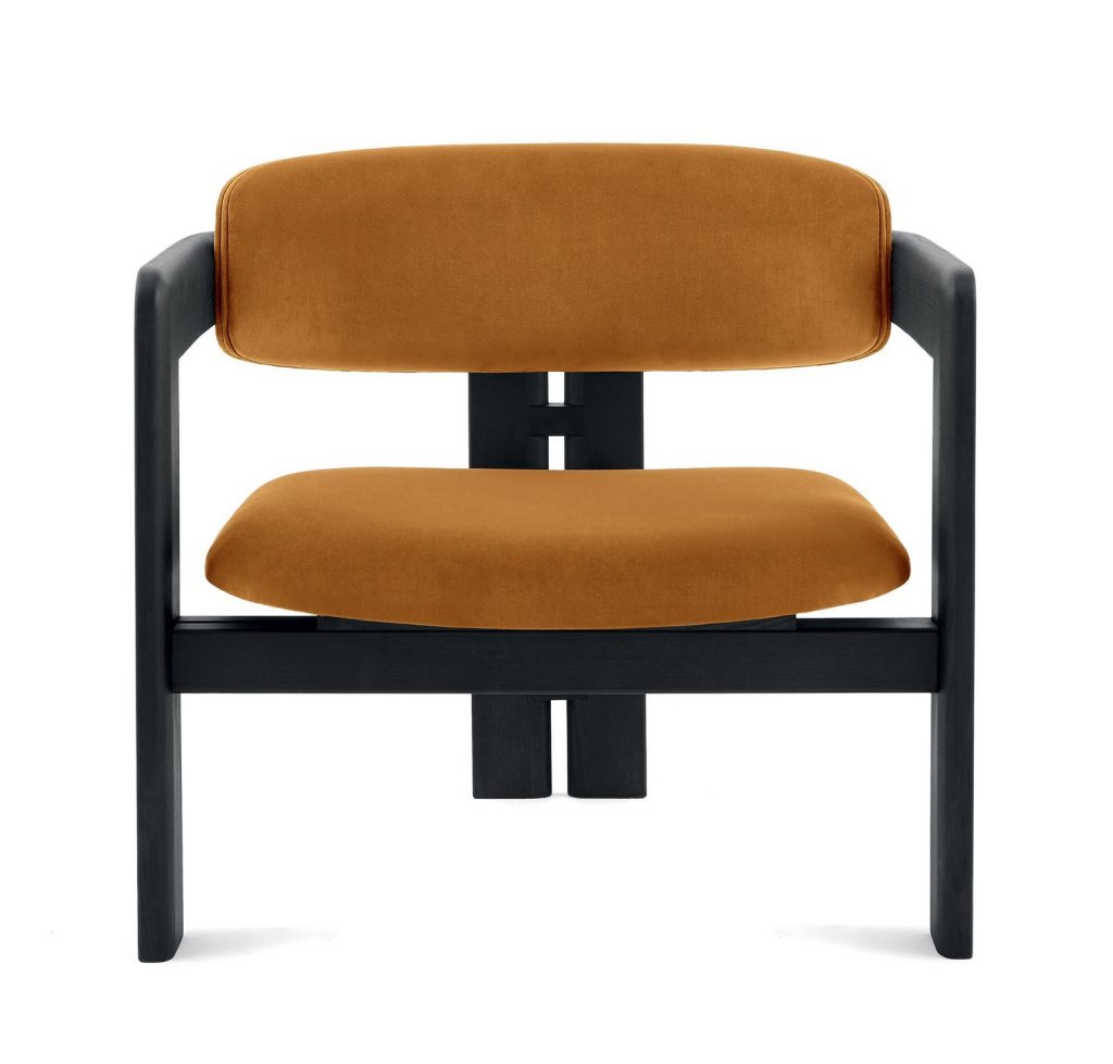 Armchair with black (mod. Layer) lacquered open pore ash structure. Available also in natural ash, tobacco stained or white open pore lacquered ash. Seat and backrest covered by fabric or leather.