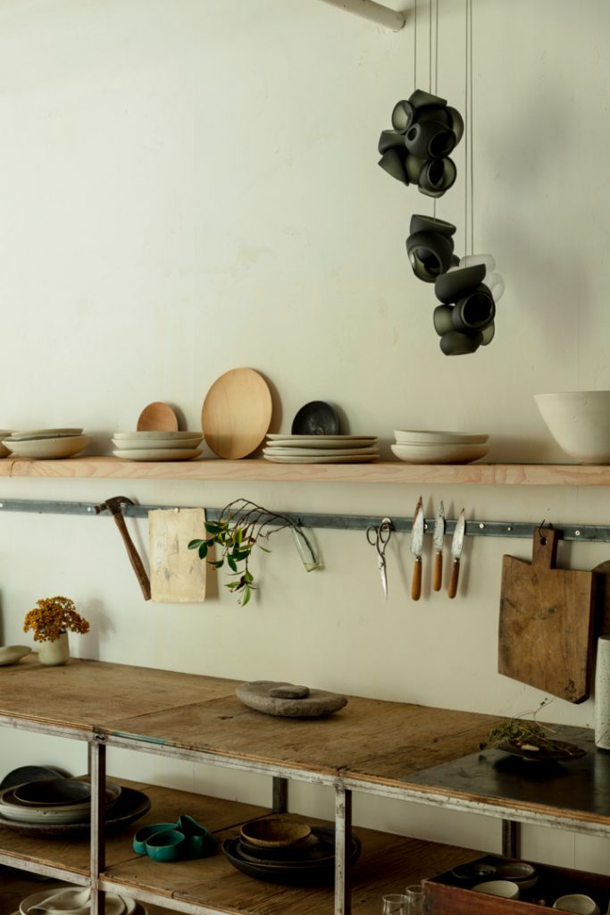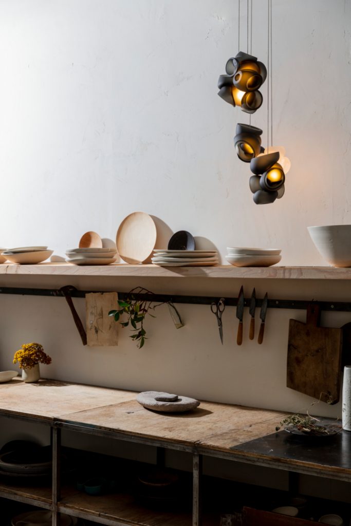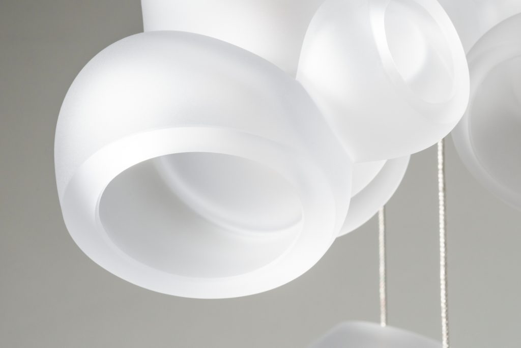 These grey with clear glass forms are sliced to reveal a freeform matrix, then frosted and lit from within.
