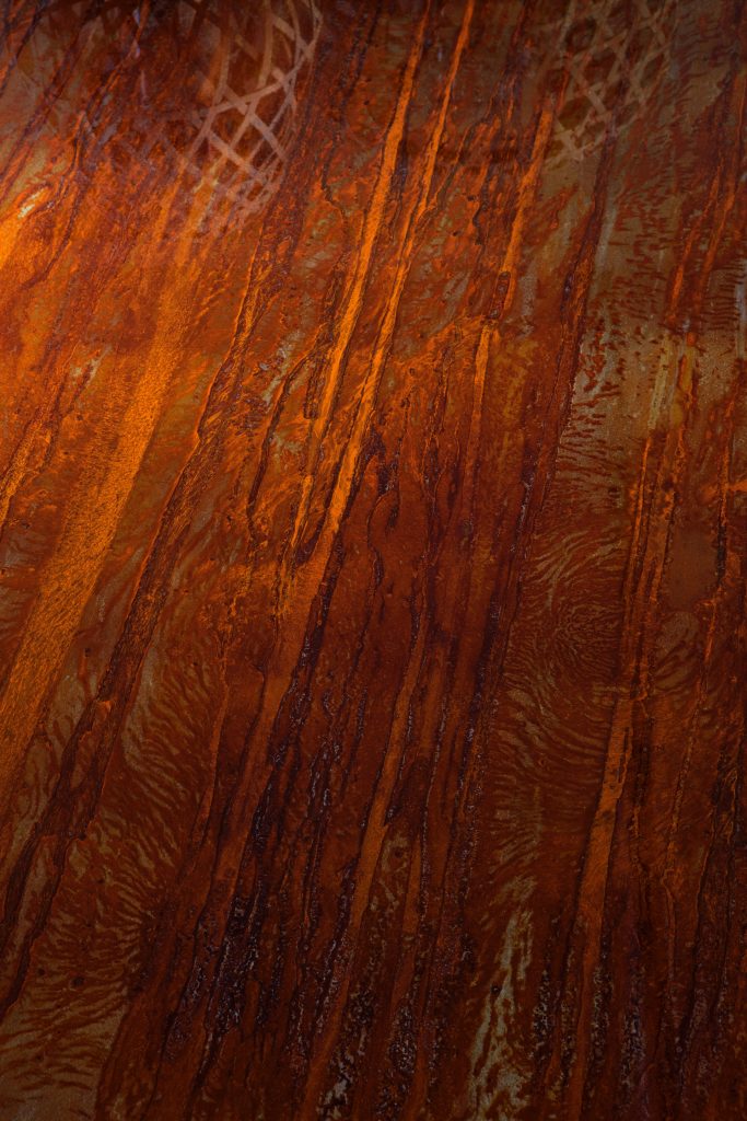 Dining table handmade from a single slab of oxidixed metal, finished with epoxy glossy paint.