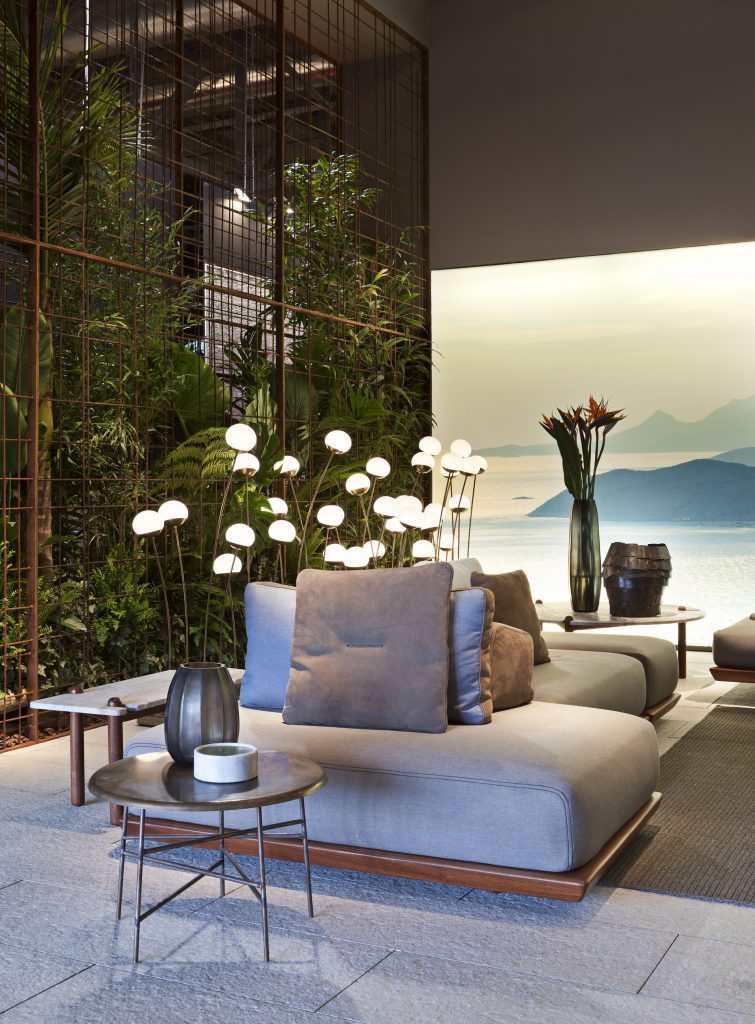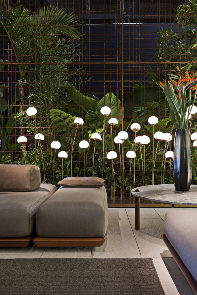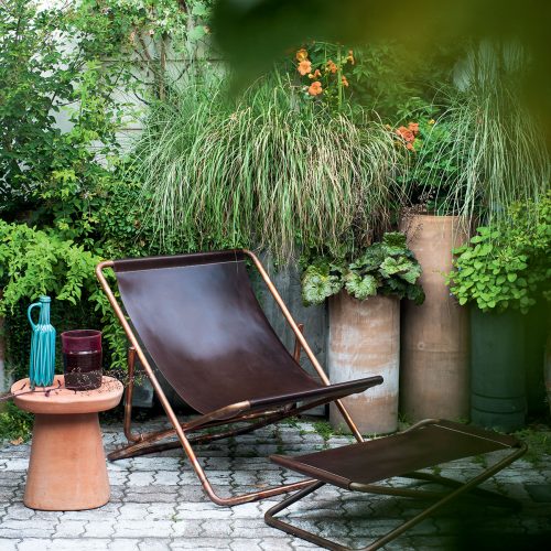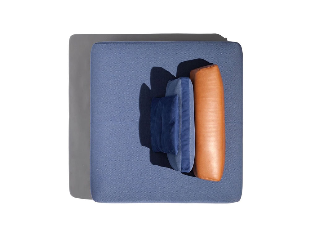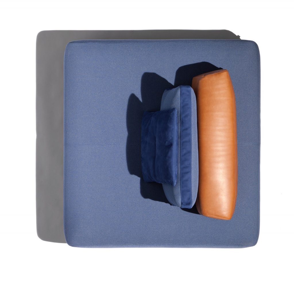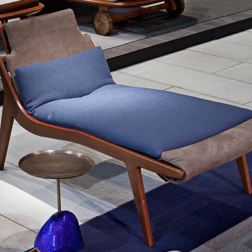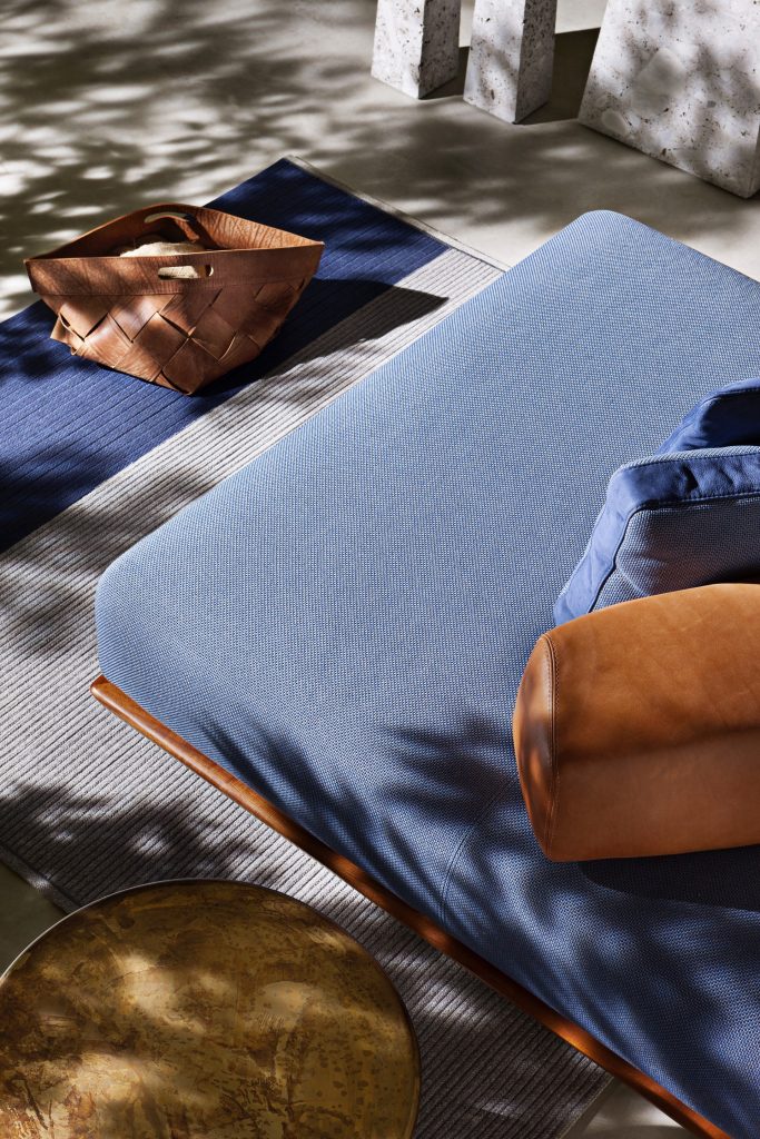 Sofa handmade in solid Sapelli mahogany. Available in outdoor fabric and outdoor leather.