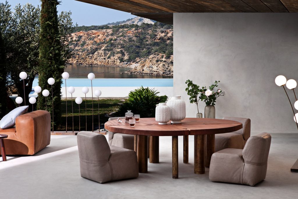 Dining table in materic slabs connected by burnished brass joints. Available in solid Sapelli mahogany in the two different RECTANGULAR and ROUND shapes.