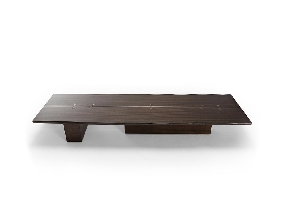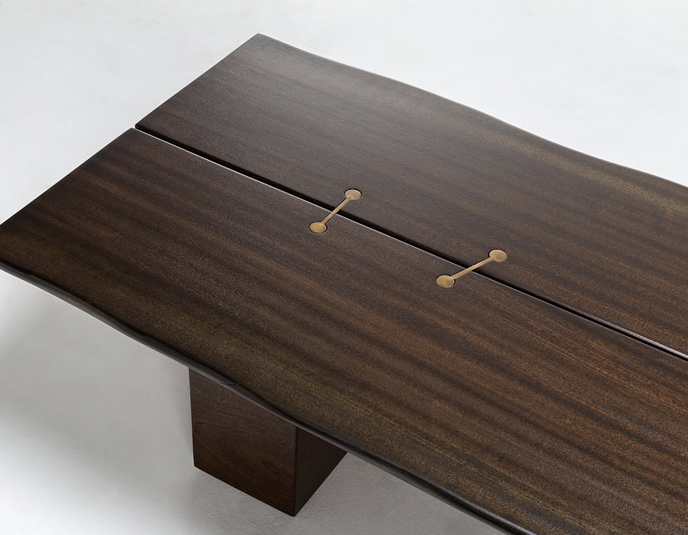 Coffee table in materic slabs connected by burnished brass joints. Available in solid Sapelli mahogany and solid Indigo wood.
