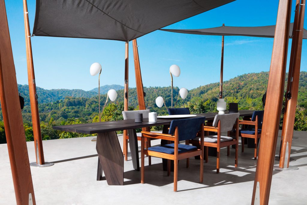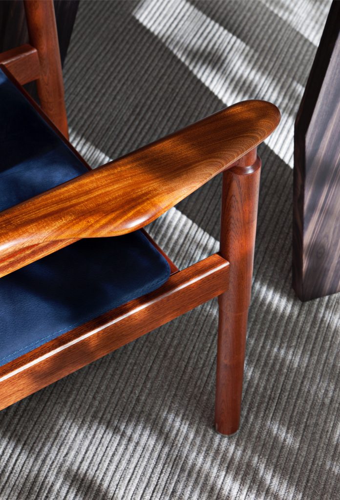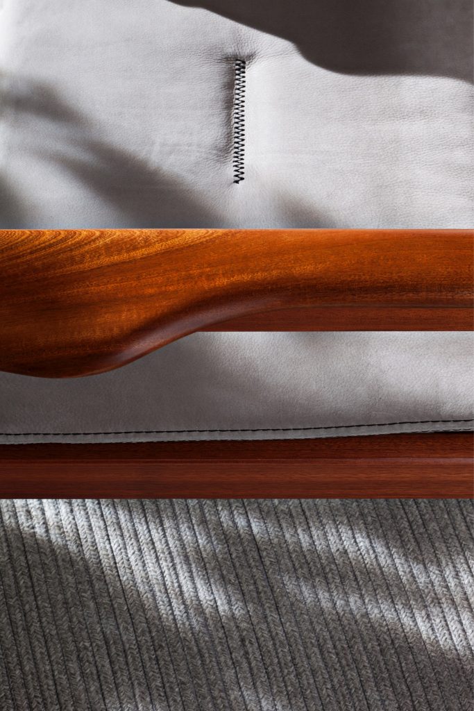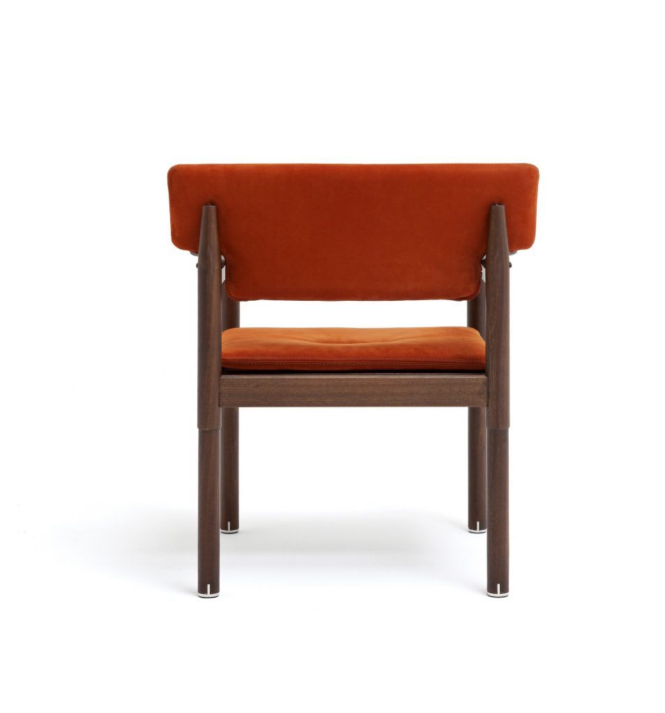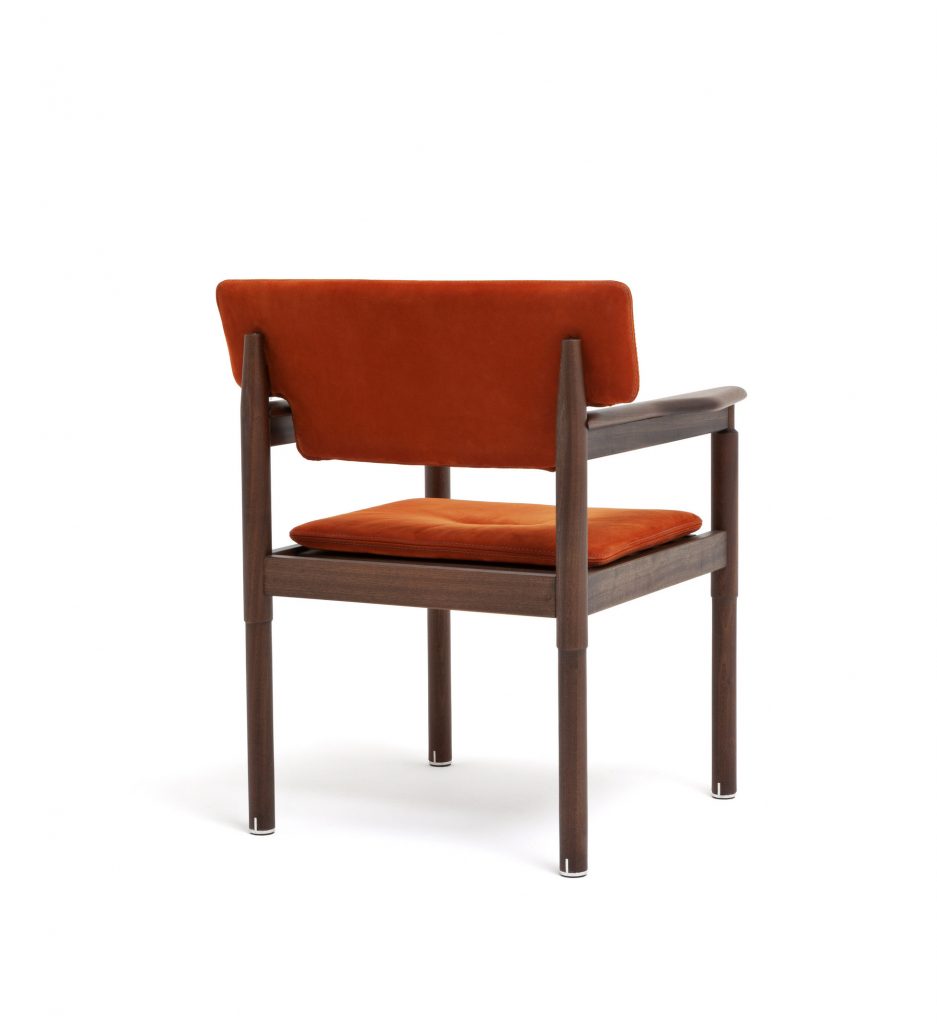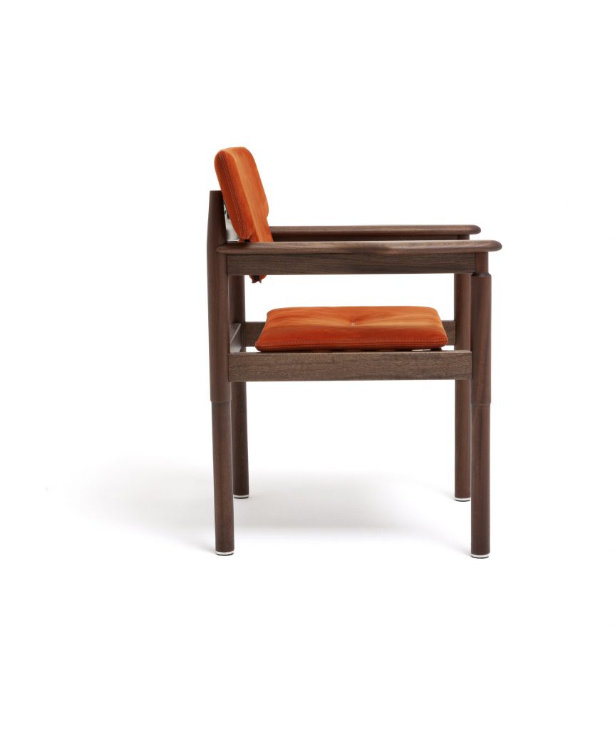 Dining chair handmade in solid Sapelli mahogany. Available in outdoor fabric and outdoor leather.