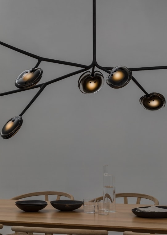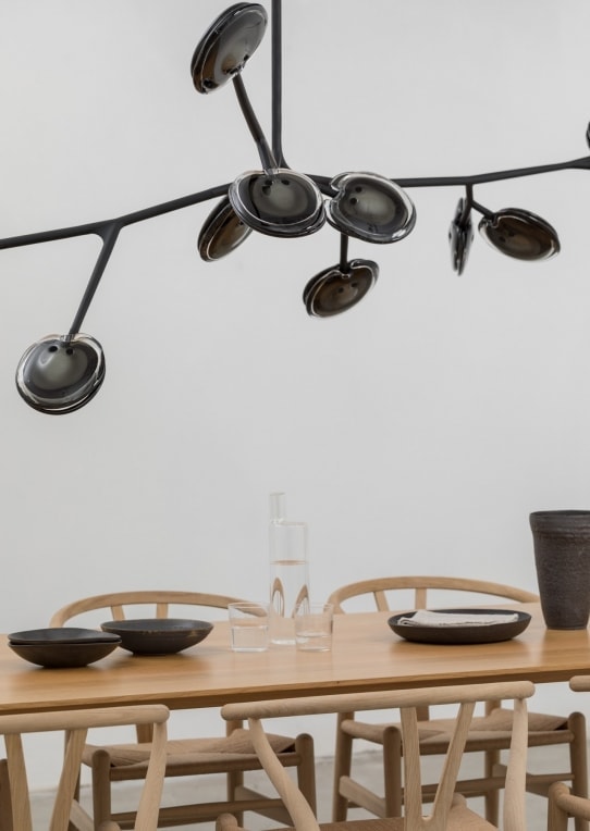 Formed by sequentially pouring three separate puddles of molten glass of varying opacity and colour over a horizontal plane. Each layer responds to the indeterminate shape of the previous pour to create a layered whole. Two of these pieces are then attached to house an internal light source.