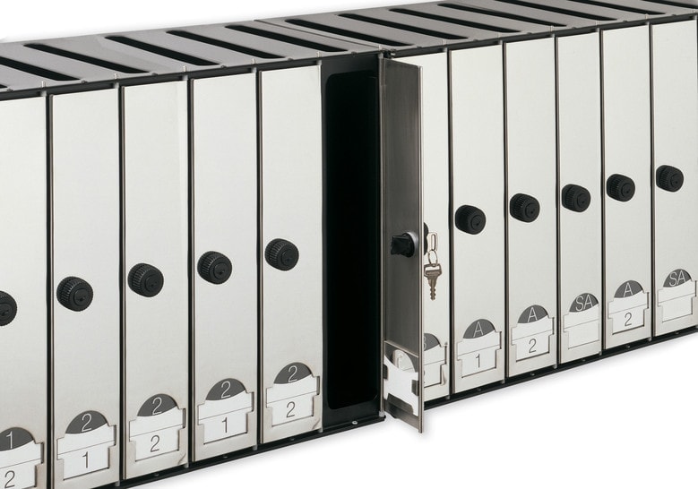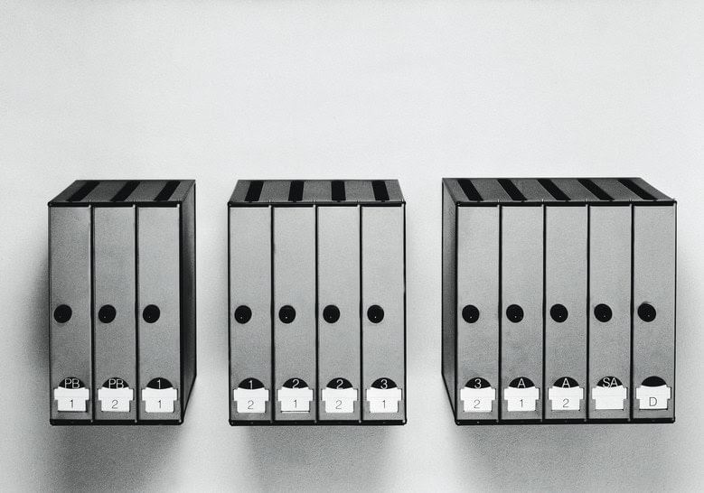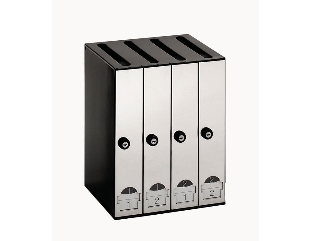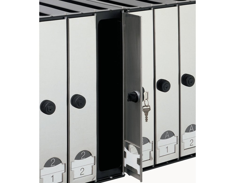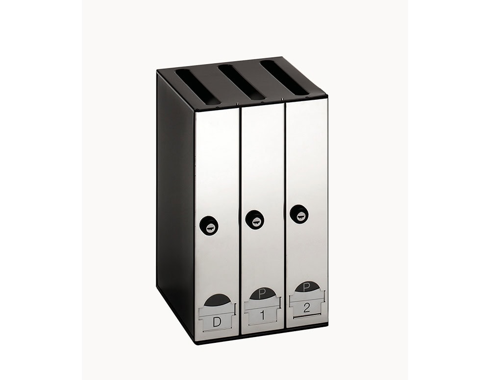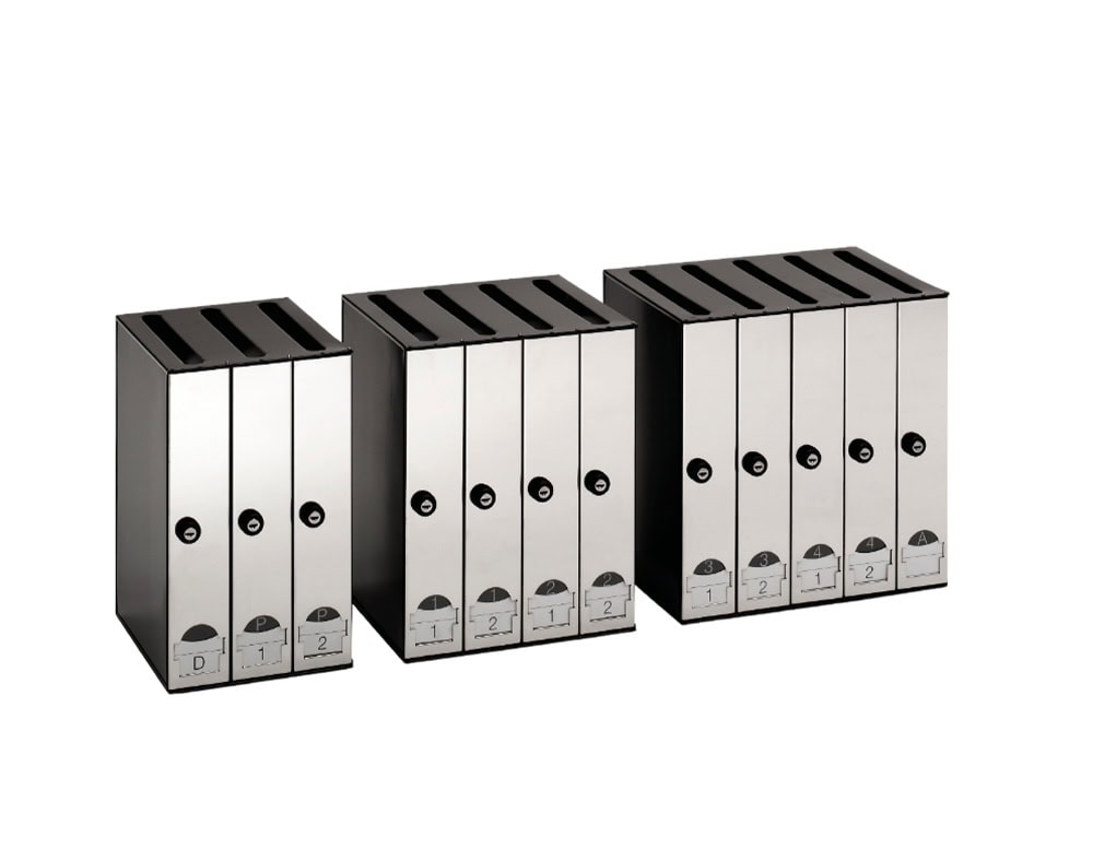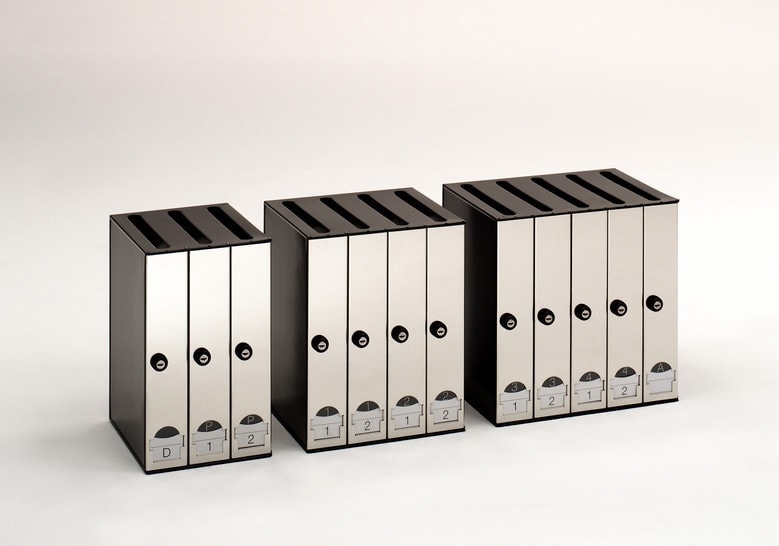 The 3-4-5 design grew from decades of design. Lluís Clotet and Oscar Tusquets developed the design from their A Sardinel mailbox, a piece made in 1975 at Studio Per. The mailbox had a tall, narrow frame to be fitted on a sardinel like a shelved book. It visually occupied less space and could be filled from the top. The current 3-4-5 is made of steel sheets painted in black with stainless steel doors and a white labelling window. It is available in blocks of three, four and five pigeonhole letterboxes. It is installed simply by placing the various blocks against the wall.