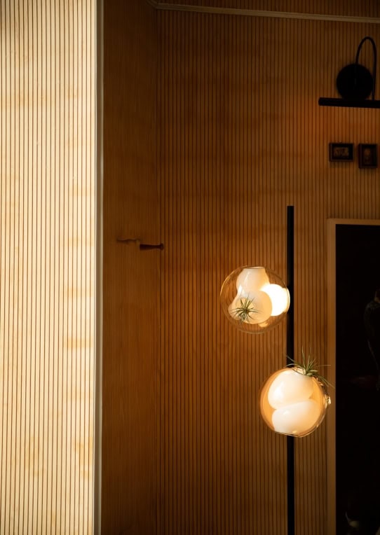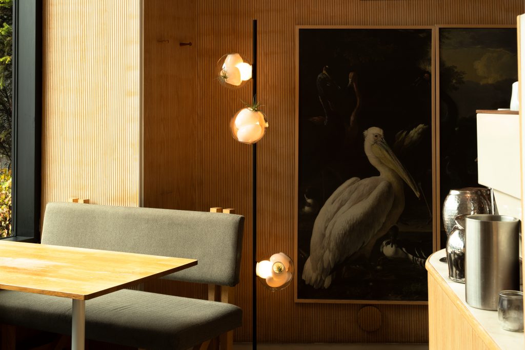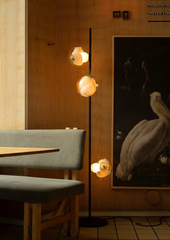 The 38V series stem floor system comes in a brass or black finish and three different configurations. The semi-rigid black fabric cord includes a patented integral 360 degree dimming system housed within a sleek brass cylinder.