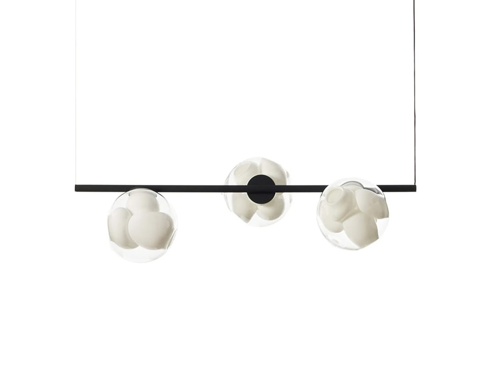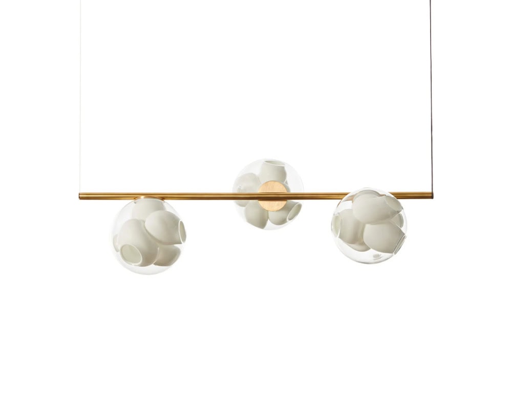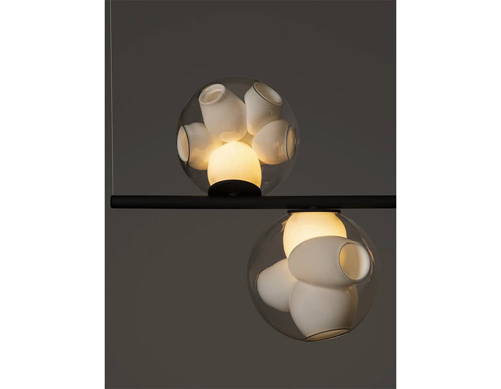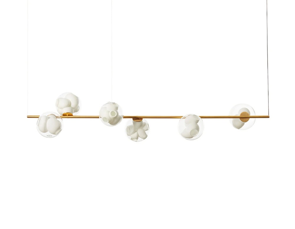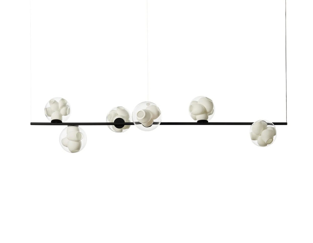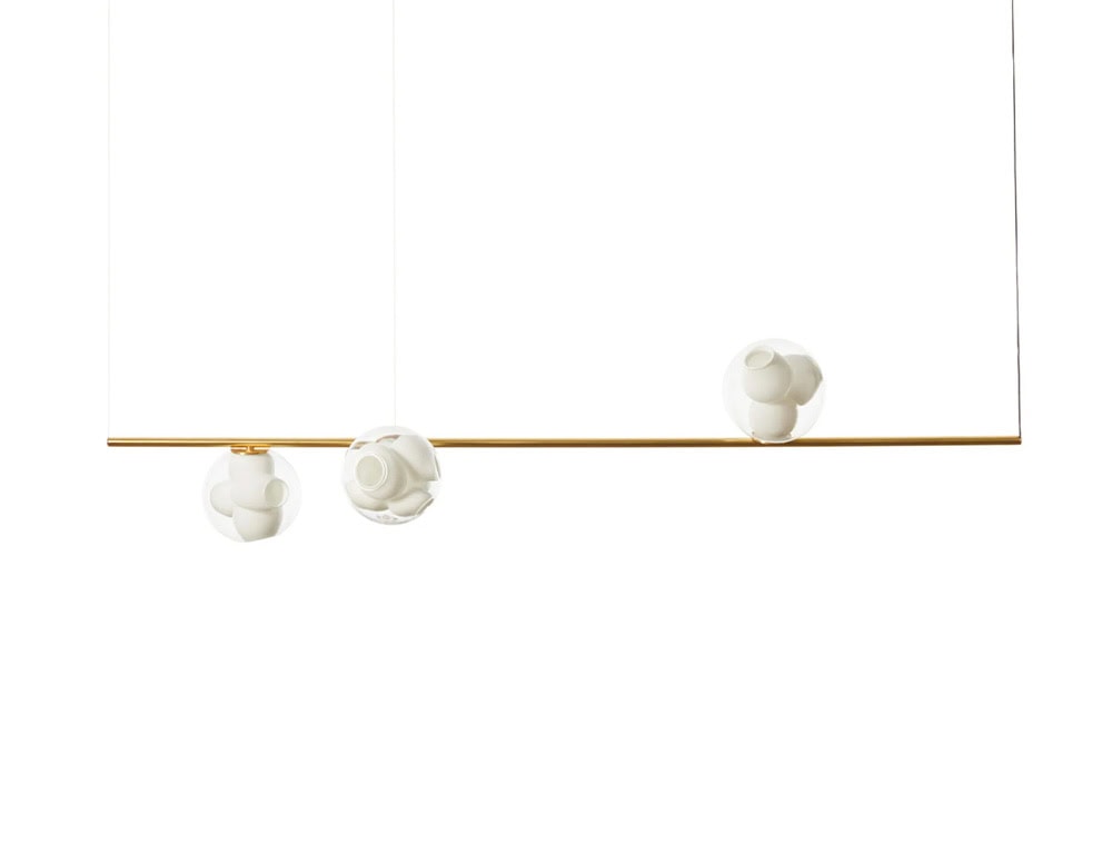 The 38V series stem suspended system comes in a brass or black finish and a variety of suspension options ranging from vertical ceiling-mounted stems to suspended horizontal stems. This system offers many options in terms of length and number of pendants.