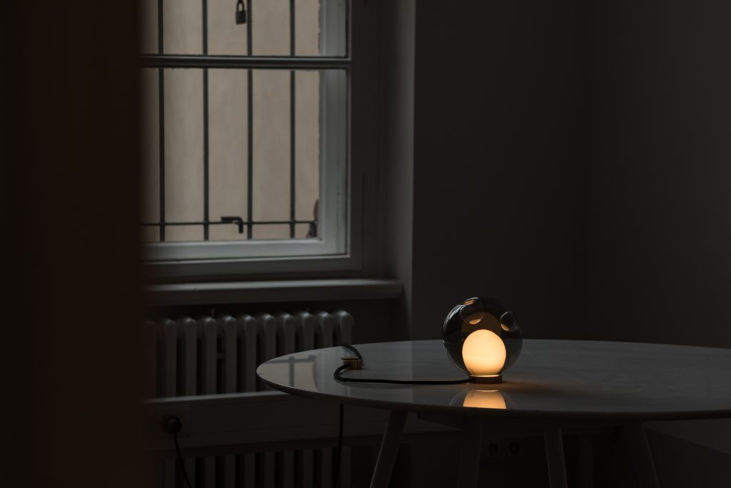 38V pendants can be used with the table light hardware, which includes an integral dimming system housed within a sleek brass cylinder. The black fabric cord is semi-rigid and may be sculpted to add form. The brass stand has a small notch on the underside, allowing it to be hung on a wall if desired.