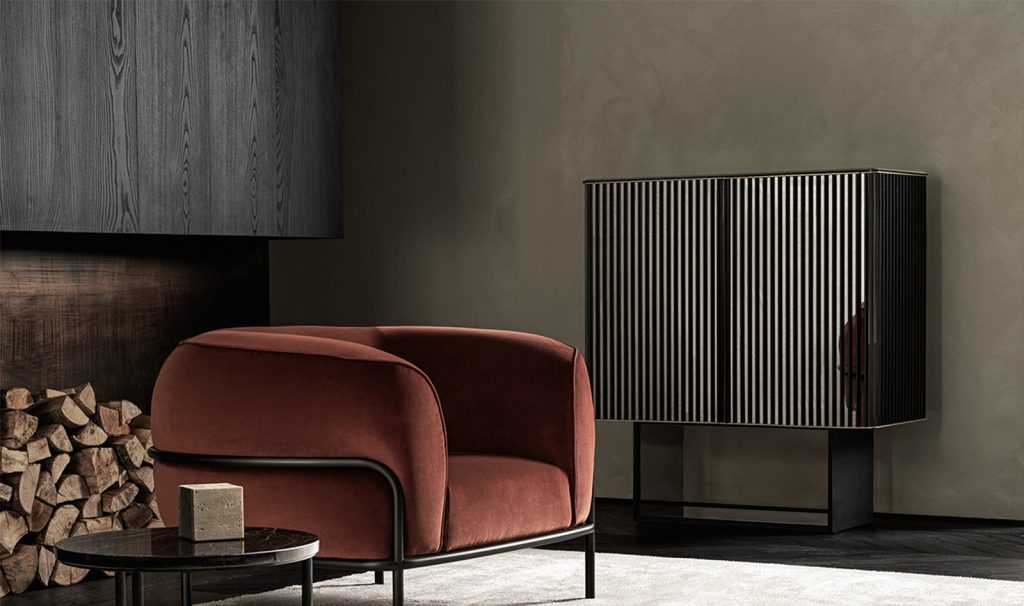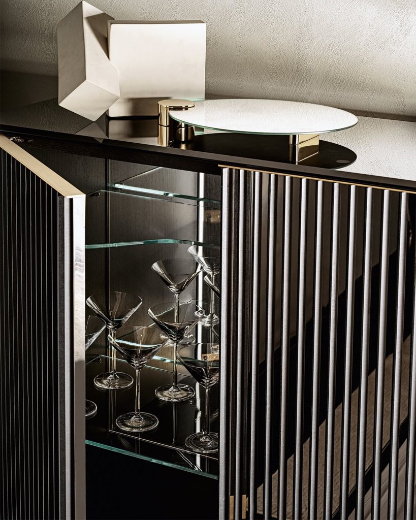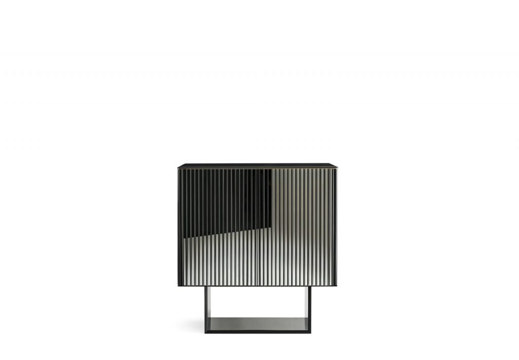 Wooden unit covered by black chromed "supermirror" stainless steel. Black lacquered open pore solid ash strips. Supplied with extralight glass shelf and mirrored inside back.