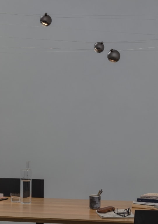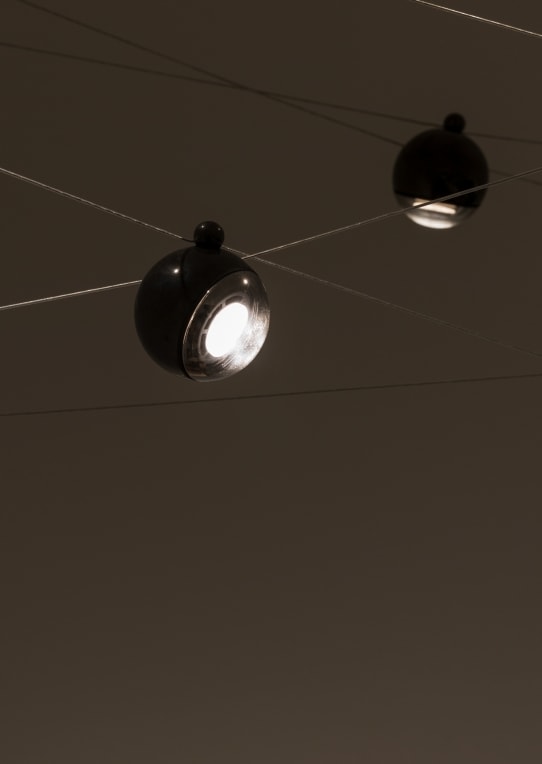 74 is a new LED spotlighting system designed as an alternative to conventional track lighting. The spotlights are housed inside articulated mirrored spheres that are affixed with a magnet, allowing maximum control over the emitted cone of light. Low voltage electricity passes through delicate coaxial cables freely composed in threedimensional space, with the adjustable spheres located at certain intersections.