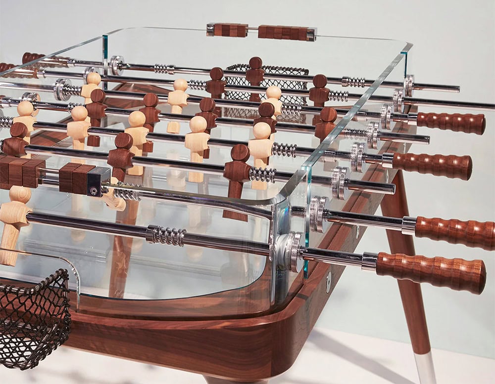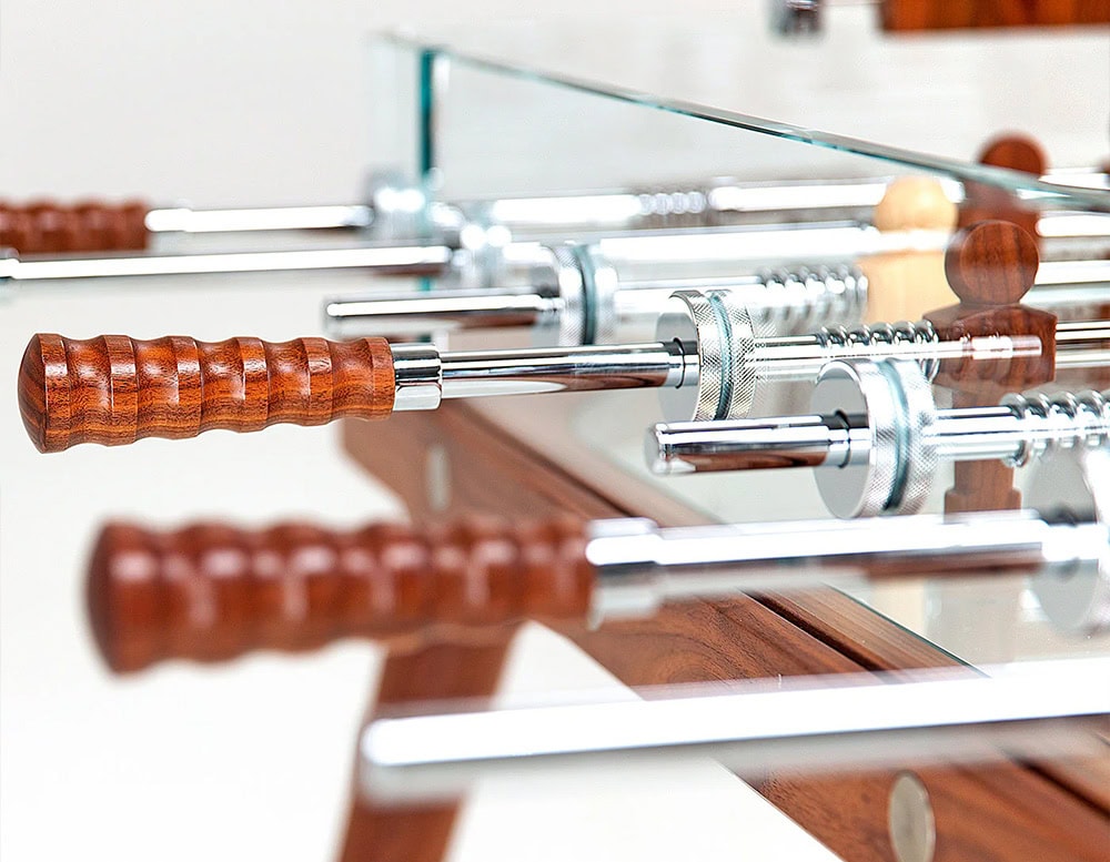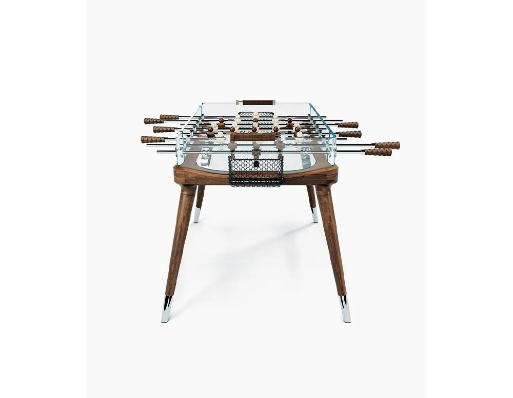 A part of the Calcio Balilla collection, 90° Minuto Classic is a foosball table with a Canaletto Walnut Wood structure. Every detail is meticulously crafted, featuring curved glass corners, dual-layer shock-absorbing rods, and discreet adjustable feet.