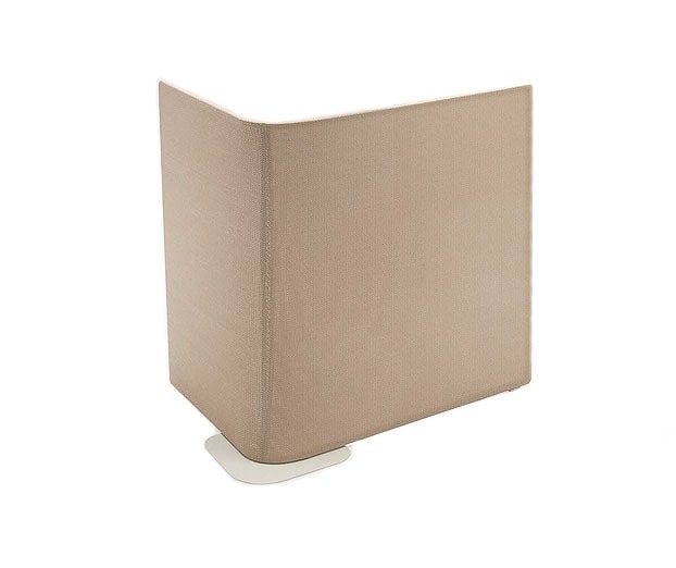 Low, Left, corner, partition screen made from a beige colored woven fiber - Thuia: Mélange. fixed directly to the aluminum structure finished in a sand tone powder coat.