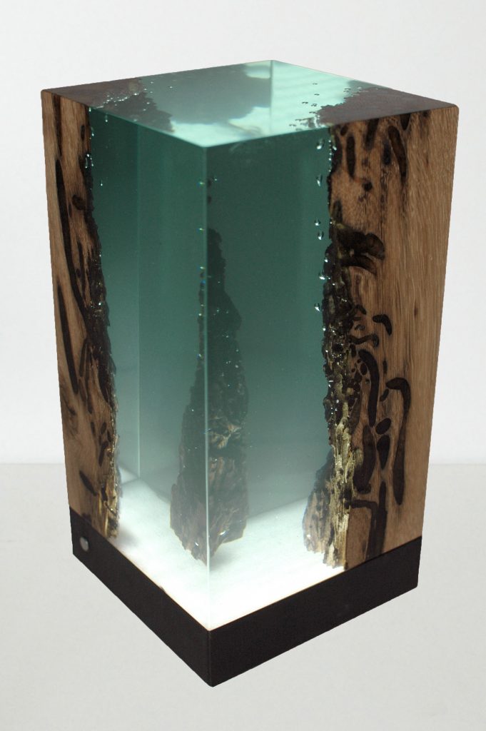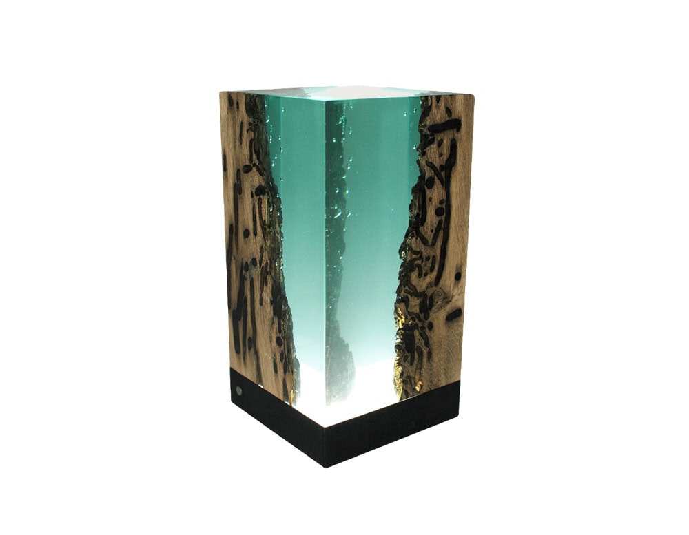 Abyss Lamp is a lamp made with a solid OAK WOOD section obtained from the Venetian Briccole poles, preserved in EXTRACLEAR RESIN resembling the Lagoon water. The light is provided by an integrated LED system, dimmer metal touch.
