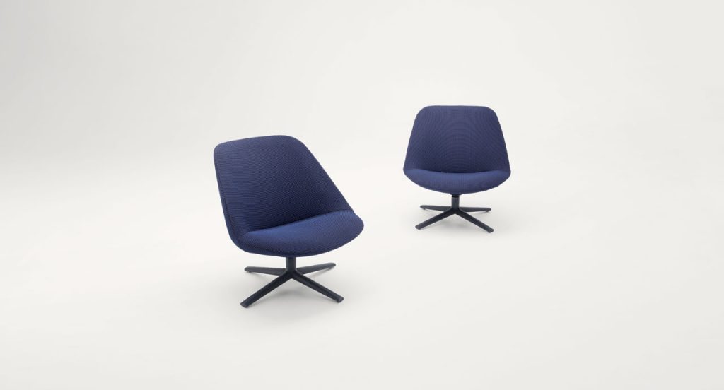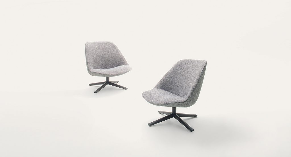 Swiveling and tilting armchair with non-removable upholstery cover and wooden base. The series Adele includes also a fixed or swiveling chair. - Structure: molded plastic material. - Base: rotating with four spokes covered with wood finished Mano Opaca or Mano Lucida. - Spacers: adjustable, in stainless steel. - Padding: stress resistant expanded polyurethane. - Upholstery: non-removable and available in a selection of fabrics in the collection.