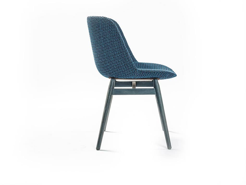 A dining chair with blue and black mixed fabric upholstery - cat. F: blend bd71. Wooden legs finished with a dark opaque stain.