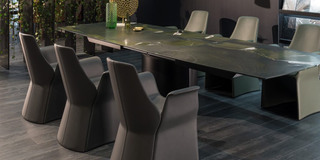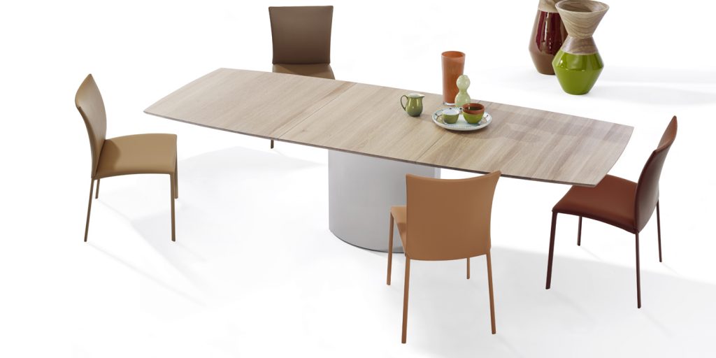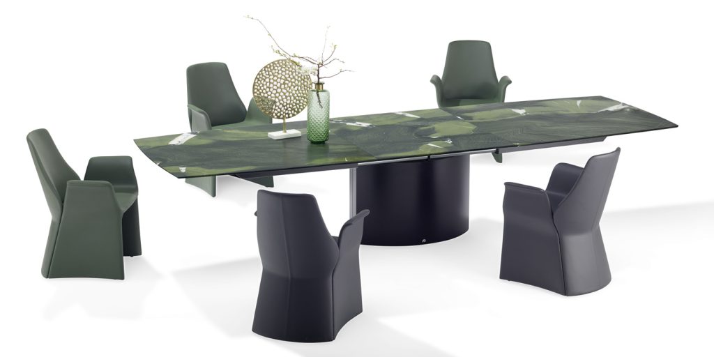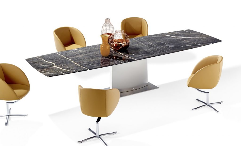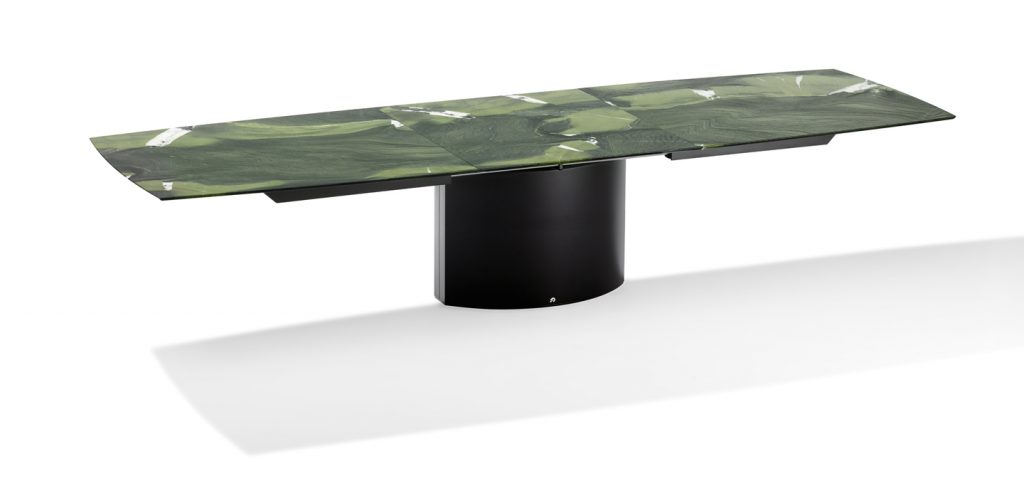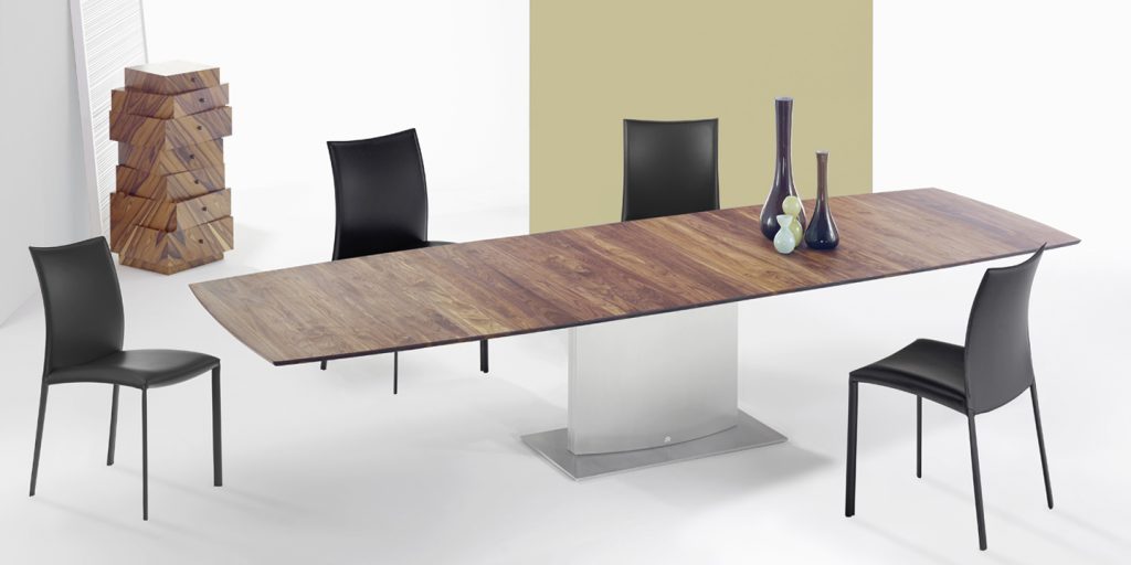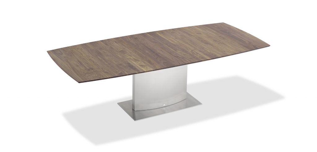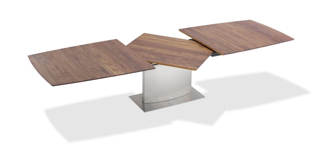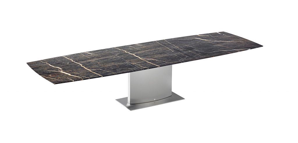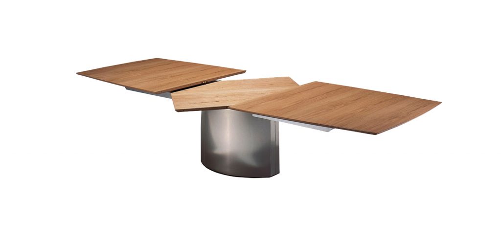 An extension dining table, boat-shaped, rectangular or organic, made of natural stone or solid wood/wood veneer with lifting mechanism for an integrated center-leaf made of stone or solid wood/wood veneer. The base is an oversized base 2 - oval of stainless steel in matt ground finish or a flat oval base 6 oversized with a rectangular base plate.