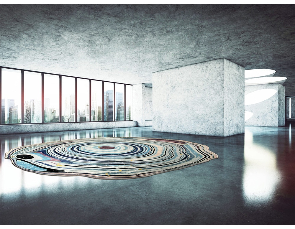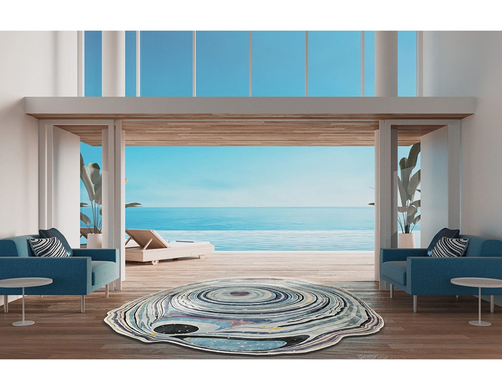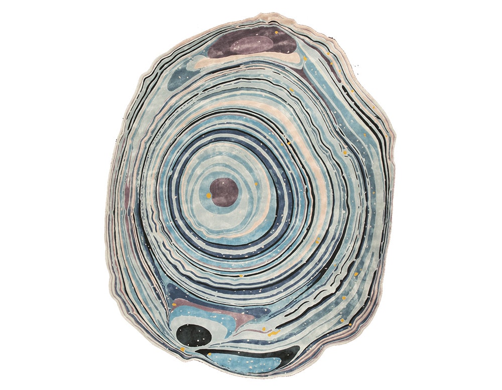 Agata Blue Lace is one of the exclusive limited edition rugs part of Sahrais Artists Selection designed in collaboration with David Elia and inspired by the mythical Brazilian Agate stone known for its uniqueness no two Agate stones are the same. This design features irregular spirals of divine shades of blue stemming from an epi-center flowing to form rings covering the entire surface of the rug.