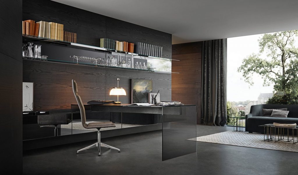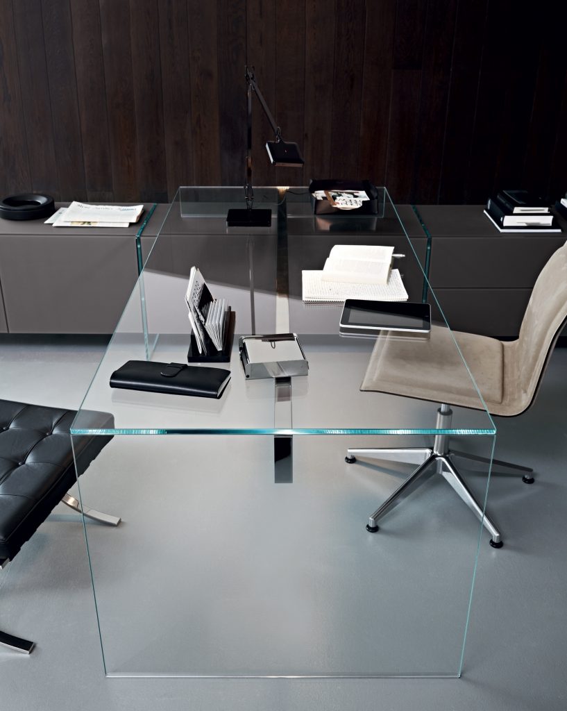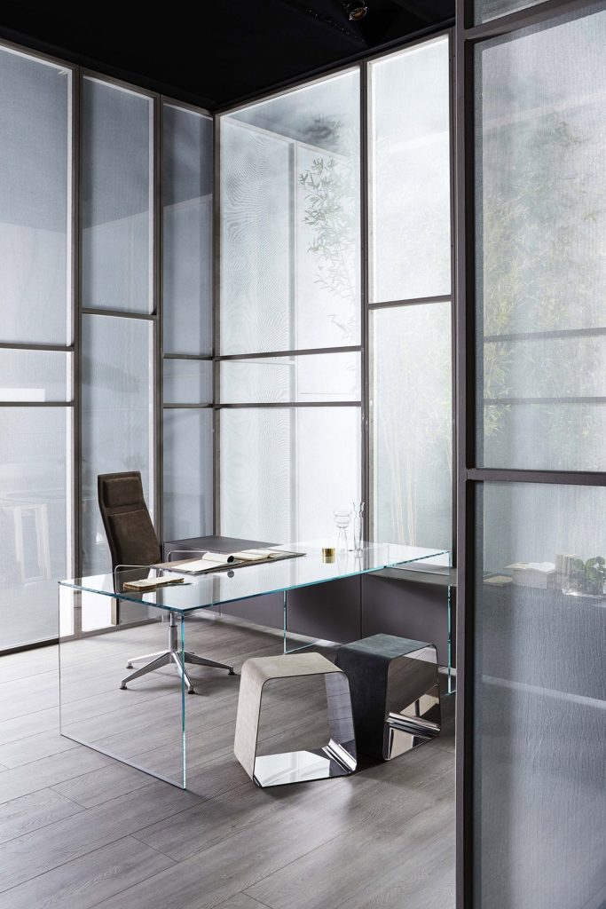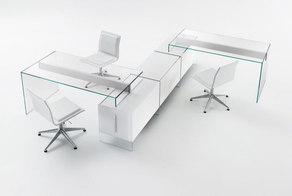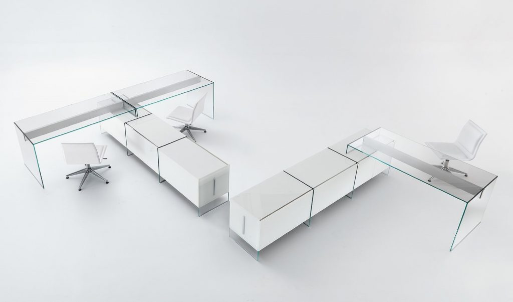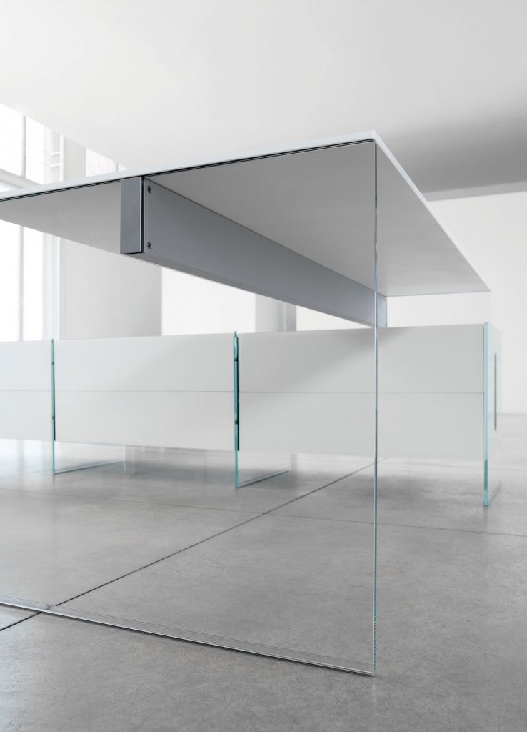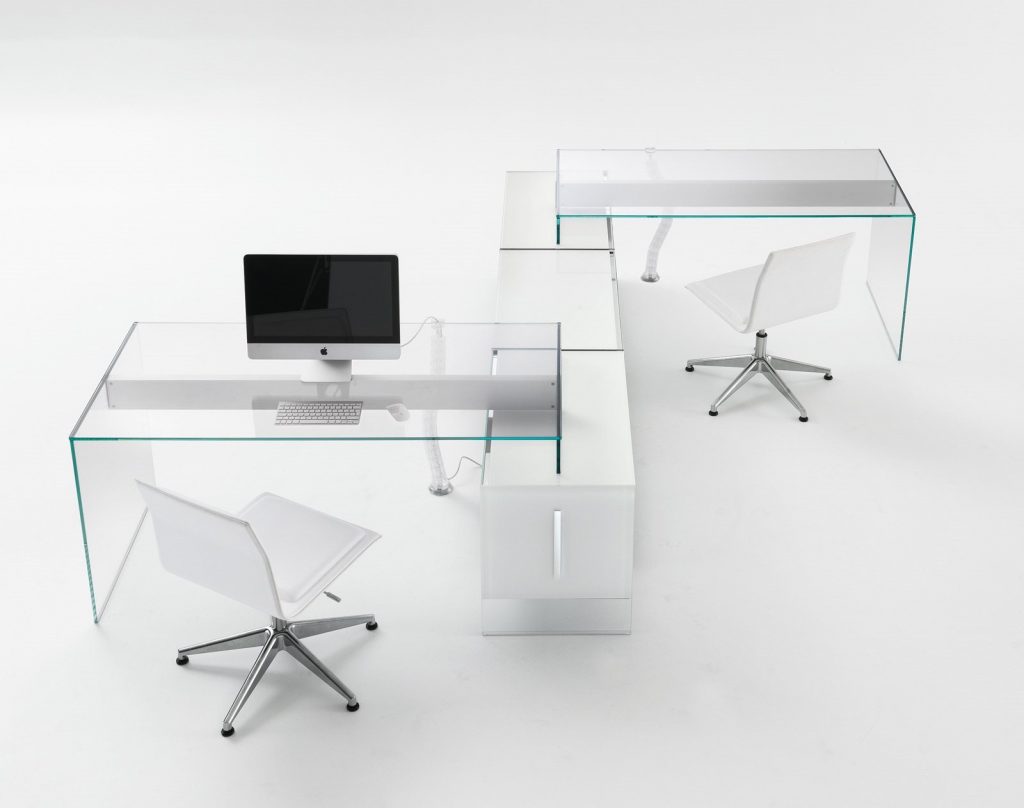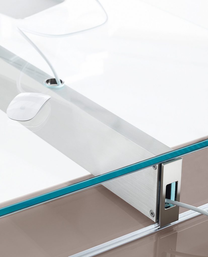 Desk with one side resting on Air Unit system in 12 mm transparent or smoked 'grigio Italia' tempered glass. Available also with painted glass top as per samples in the bright or satin version. Leather effect laminated glass top, on request. Bright or satin stainless steel, anodised aluminium or embossed white or black lacquered metal parts. Hand brushed aluminium in the colours black or titanium grey, on request. For a proper cable management, a hole on the top can be arranged upon request. Minimum distance from the edge: 10 cm.