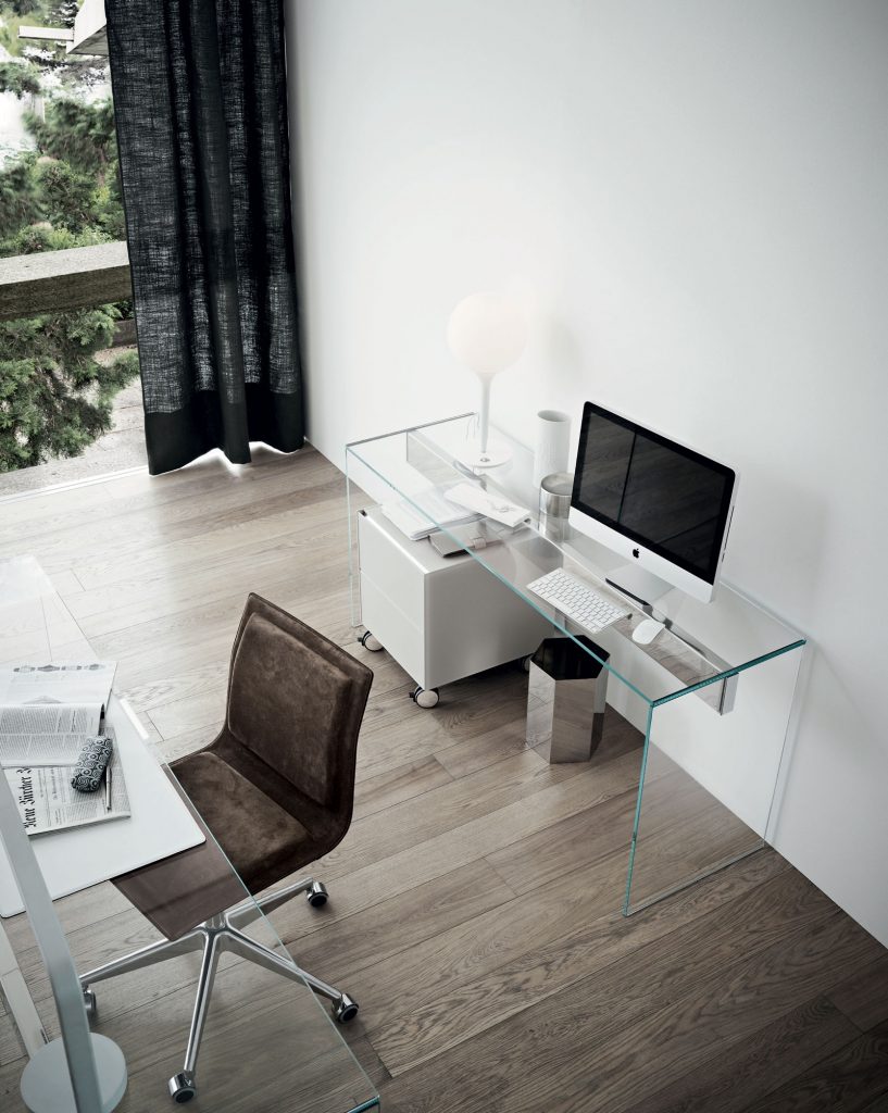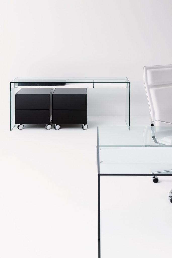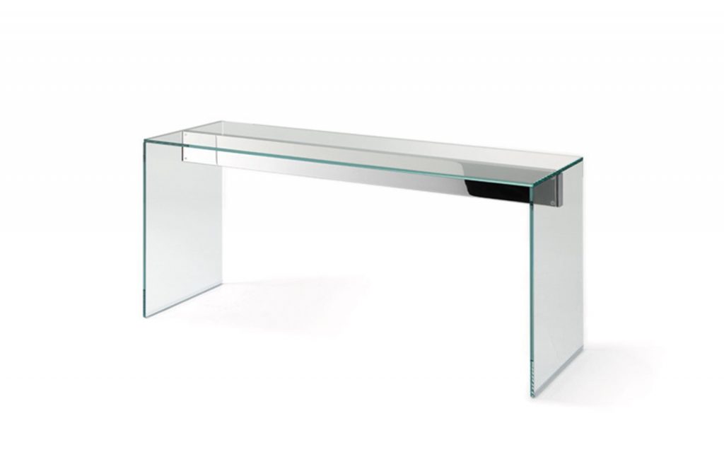Console in 12mm transparent or smoked 'grigio Italia' tempered glass. Available also with painted glass top as per samples in the bright or satin version.Leather effect laminated glass top, on request. Bright or satin stainless steel, anodised aluminium or embossed white or black lacquered metal parts. Hand brushed aluminium in the colours black or titanium grey, on request.