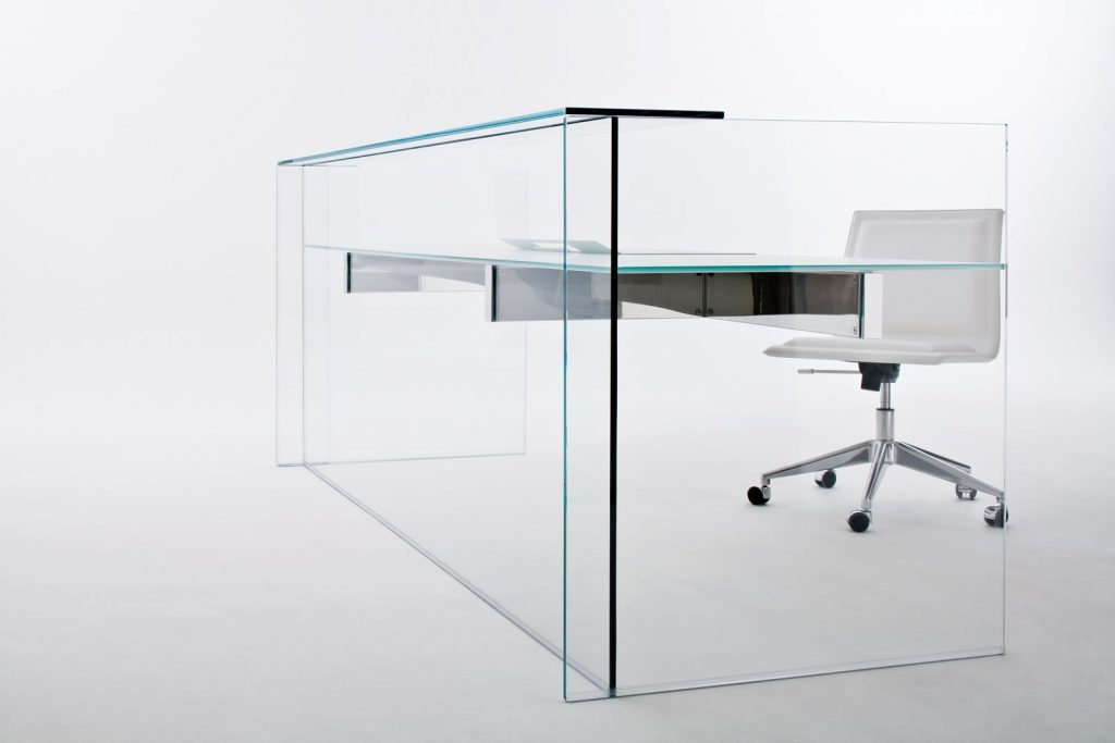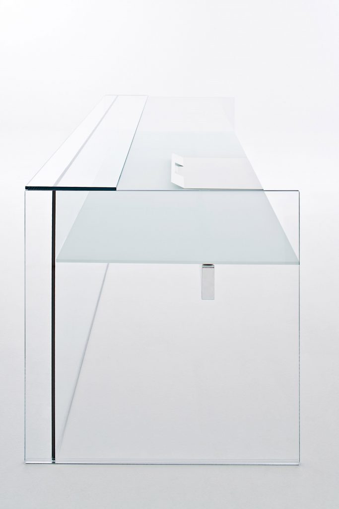 Reception desk in 12 mm tempered painted glass top as per samples in the bright or satin version. Available also with front panel and sides in painted glass as per samples in the bright or satin version (Options A, B, C and D). Bright or satin stainless steel, anodised aluminium or embossed white or black lacquered metal parts. Hand brushed aluminium in the colours black or titanium grey, on request. For a proper cable management, a hole on the top, can be arranged upon request. Minimum distance from the edge: 10 cm.