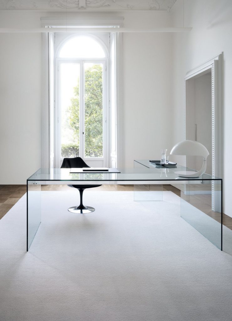 Desk with return in 12mm transparent or smoked 'grigio Italia' tempered glass top. Available also with painted glass top as per samples in the bright or satin version. Leather effect laminated glass top, on request. Bright or satin stainless steel, anodised aluminium or embossed white or black lacquered metal parts. Hand brushed aluminium in the colours black or titanium grey, on request. Return available on right or left side. For a proper cable management, a hole on the top can be arranged upon request. Minimum distance from the edge: 10cm.