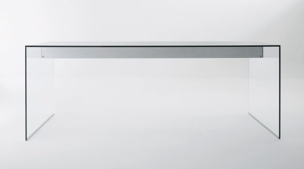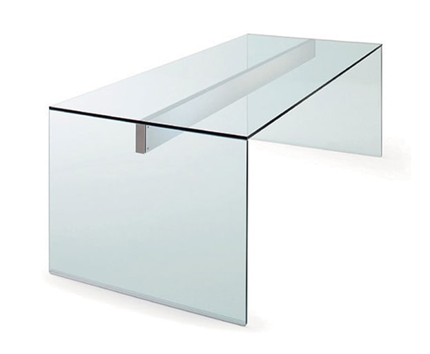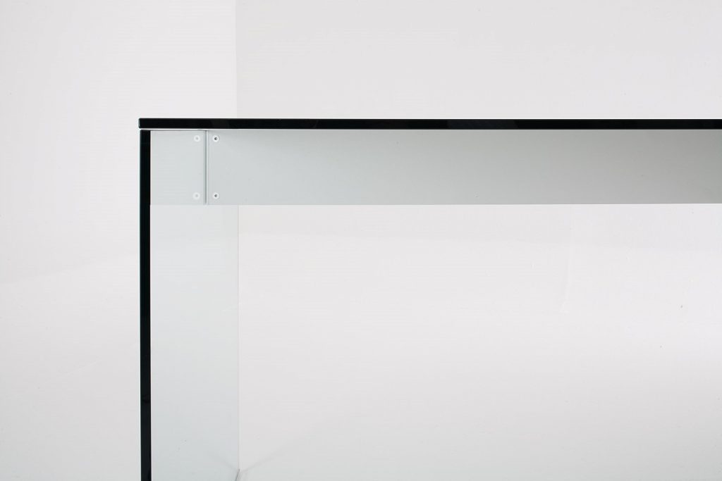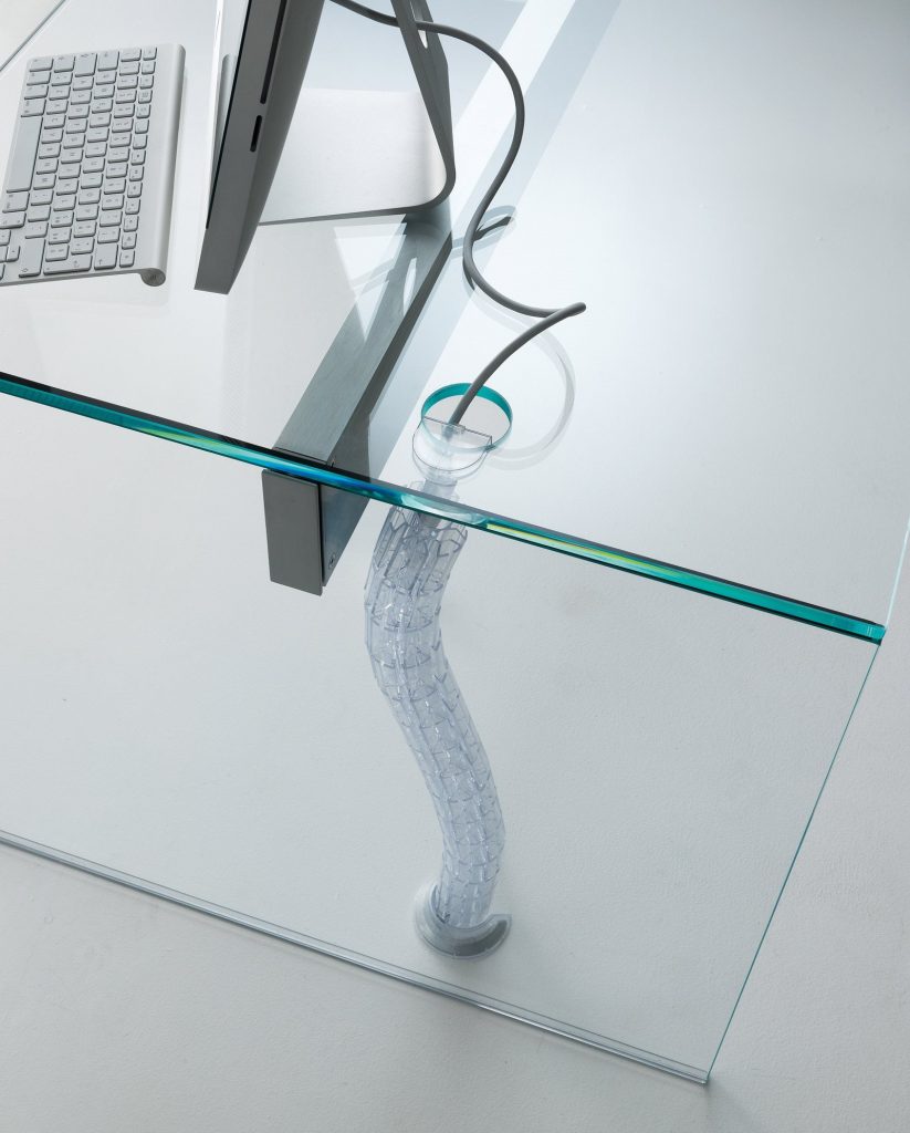 Desk in 12 mm transparent or smoked "grigio Italia" tempered glass. Available also with painted glass top as per samples in the bright or satin version. Leather effect laminated glass top, on request. Bright or satin stainless steel, anodised aluminium or embossed white or black lacquered metal parts. Hand brushed aluminium in the colours black or titanium grey, on request. For a proper cable management, a hole on the top can be arranged upon request. Minimum distance from the edge: 10 cm.
