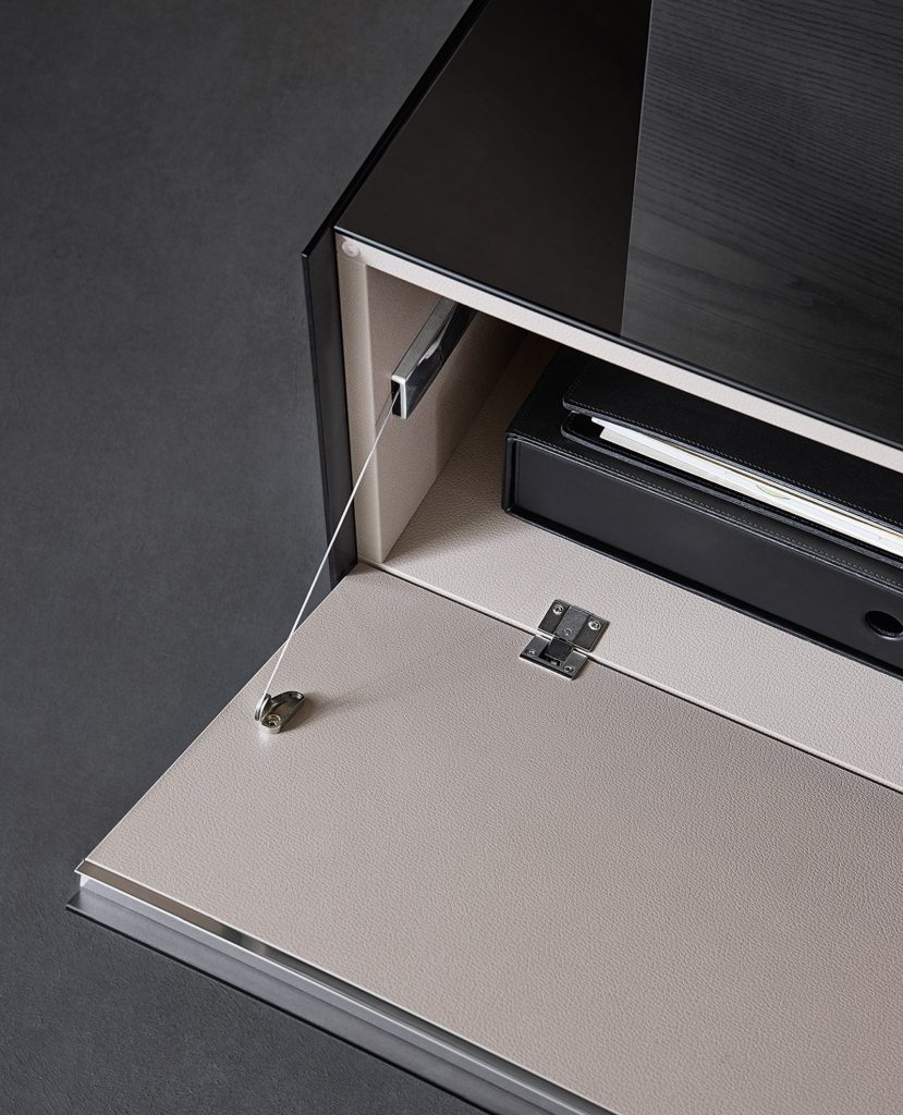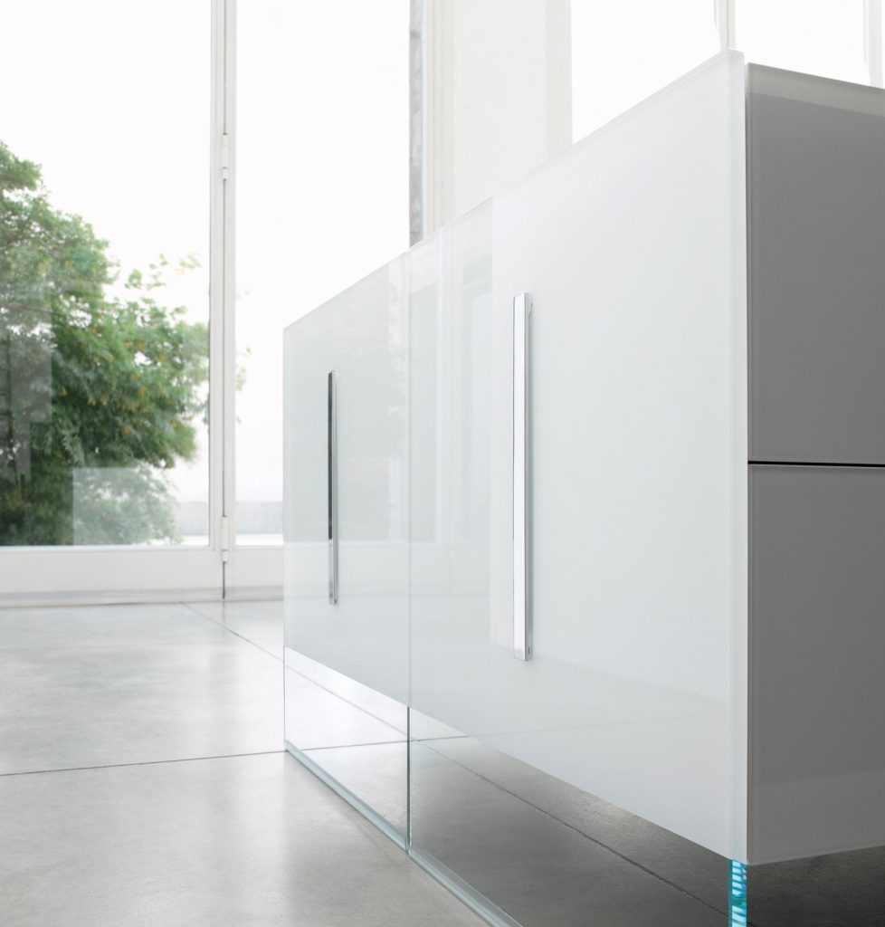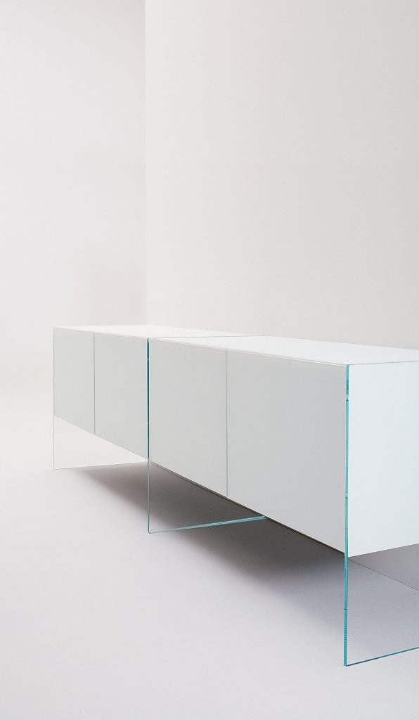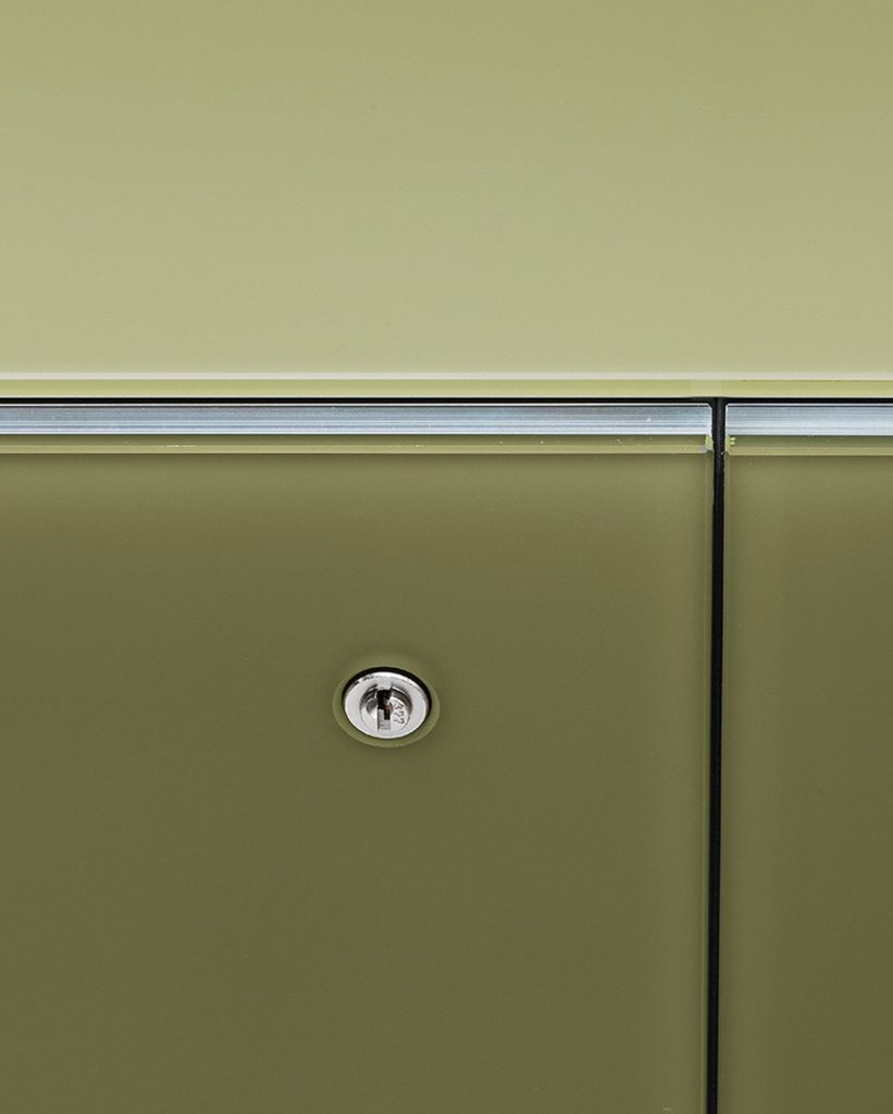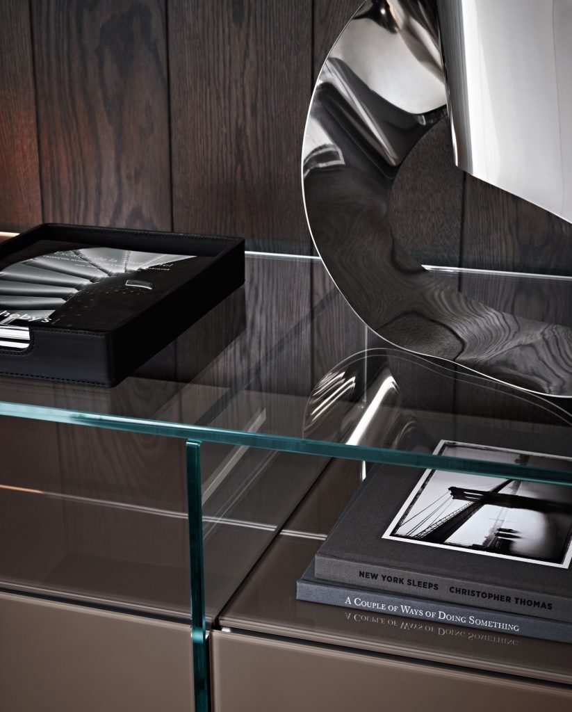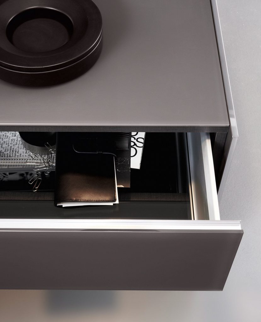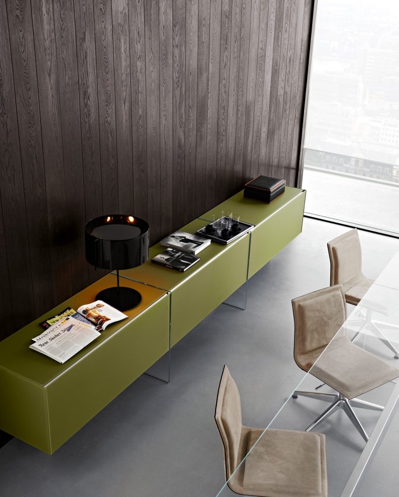 Modular system of wooden elements covered by painted glass as per samples in the bright or satin version or in extralight mirror. Smoked "grigio Italia" mirror for suspended version and for the units U06, U06R only. Available as freestanding version with 12 mm tempered extralight transparent glass side or suspended version. For compositions as a room divider is available a painted glass back. Bright anodised aluminium metal parts. The inside of Air Unit is made of leather effect laminated wood.