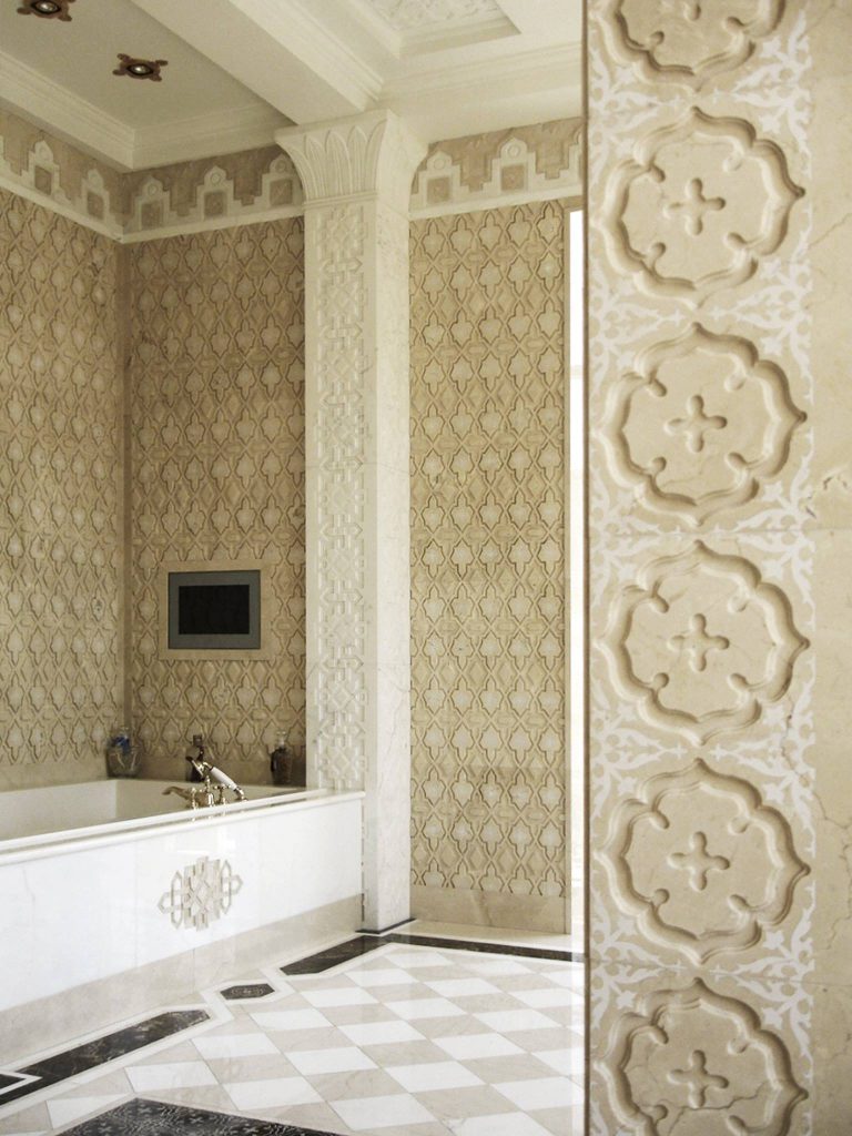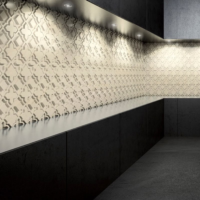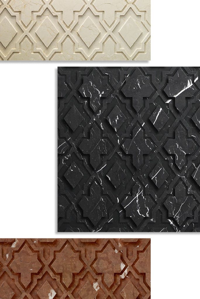 Alhambra is an intricately carved marble tile, inspired by a coat of arms - the perfect design choice to add a subtle elegance and depth to any space. This design is produced with the bas relief method in a brushed finish and is available in a variety of marbles. Suitable for both home and contract.
