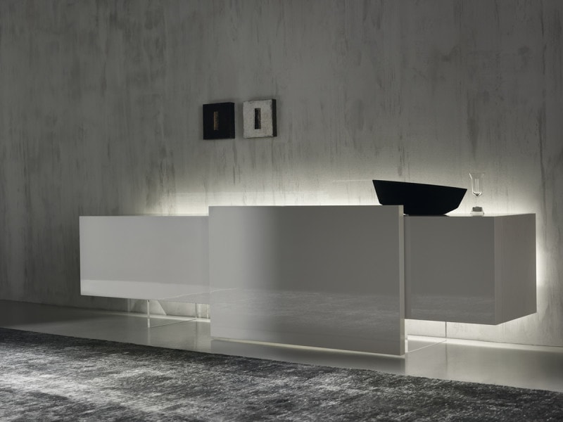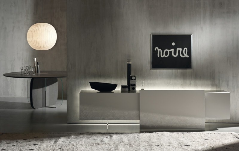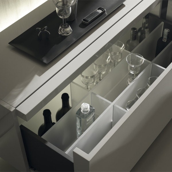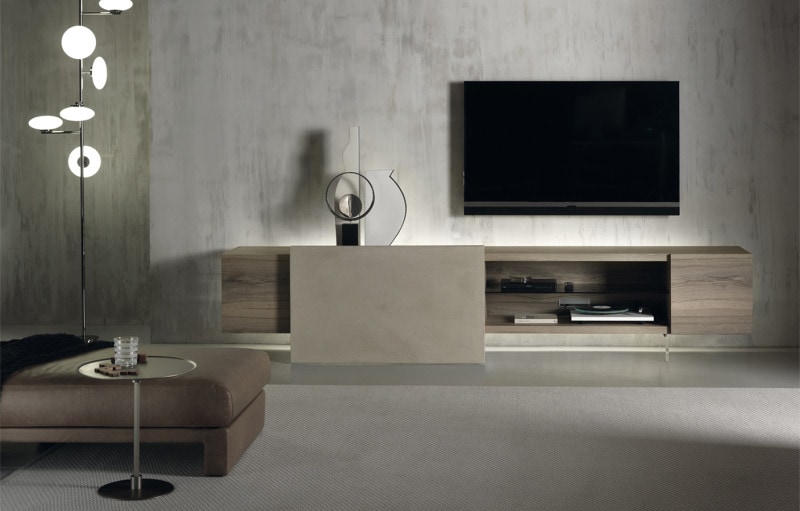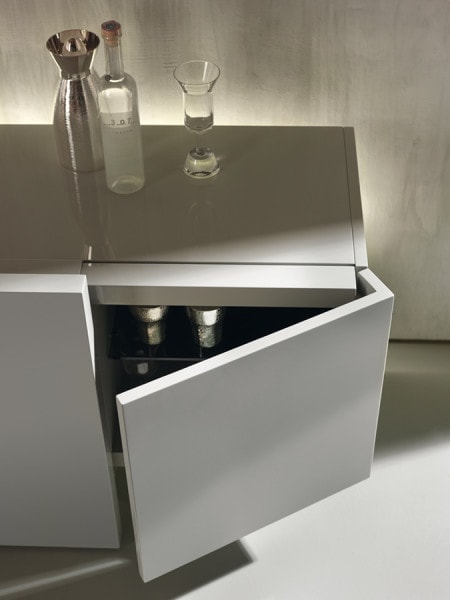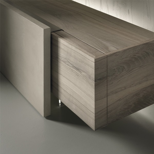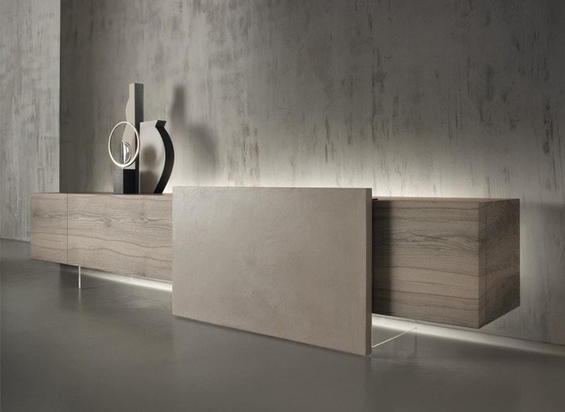 Alterego Low springs from designer Giacomo Moor's sensitivity for craftsmanship combined with his deep knowledge of materials, which are united with Acerbis's ability to experiment and innovate the opening systems, making movement itself an element of aesthetic and functional design. The result is a rigorous, linear volume, with generous proportions but extremely light thanks to the transparent methacrylate base and the back-lighting system that create an unusually beautiful suspended effect, making the full-height front panel seem to be the only support element, which at a first appears to be fixed. The unit combines three different opening systems: hinged door, drawer and a sliding front panel, which moves freely across the body of the structure, revealing an additional compartment. Alterego Low is dedicated both to storage and to home entertainment, designed to accommodate even the most modern multimedia systems, with its central compartment and side compartments with transparent grey glass shelves and an internal system of openings for wires. The drawer is backlit and can be equipped with an opalescent methacrylate bottle holder bar accessory. The cabinet, the hinged doors and the extractable drawer are available in Eucalyptus, Black Eucalyptus, Swamp Oak, Swamp Ash wood, or glossy or matt lacquered, with the full-height front panel lacquered tone-on-tone matching with the structure or in contrasting material with a brushed Nickel-15 metal finish, or in the new Volcanic earth-based cement coating in Lipari White, Vesuvio Brown or Etna Grey colors and protected by a surface finish with special resins.