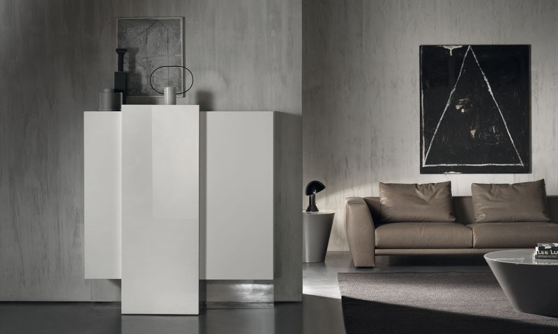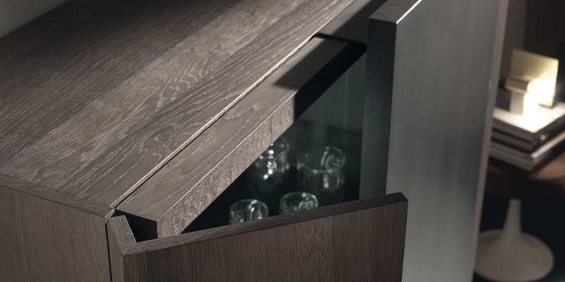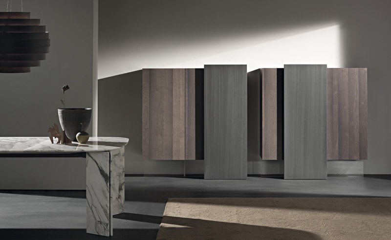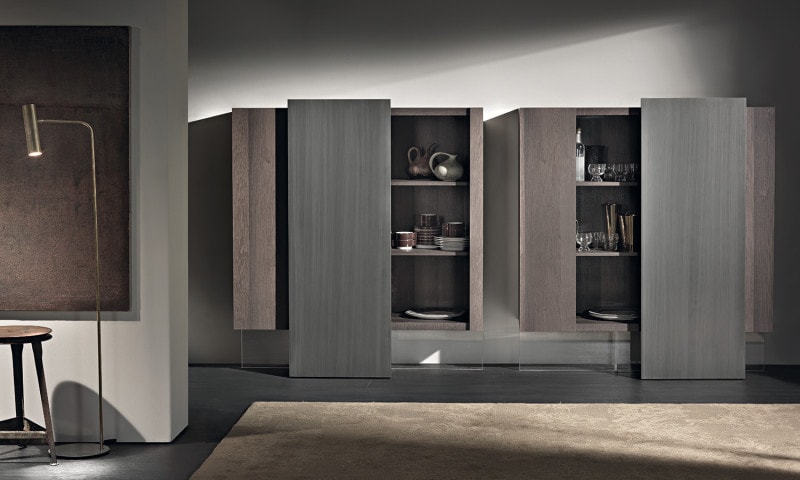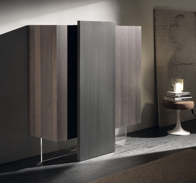Identities strengthened by asymmetry: harmonious together, but with independent potential. The two vertical Alterego sideboards are conceived from a craft vision that creates an association between the woods and the hand brushed metal effect finish. Two distinct sideboards that differ in the layout of the doors with the double sliding and hinged door system, finding unity in their sculptural forms and in the suspended effect of the structure
