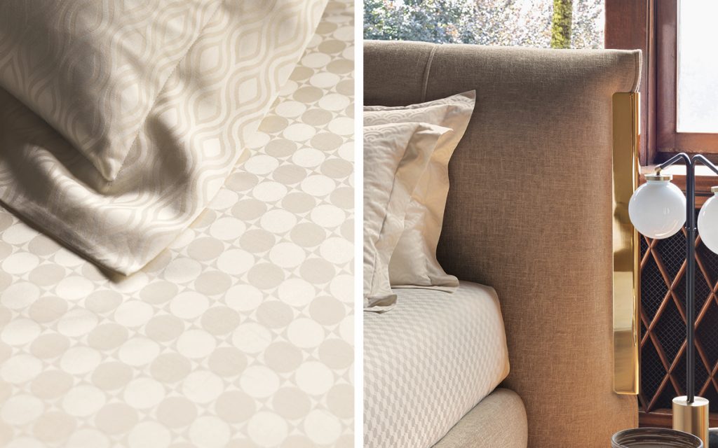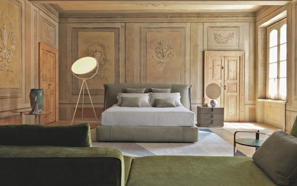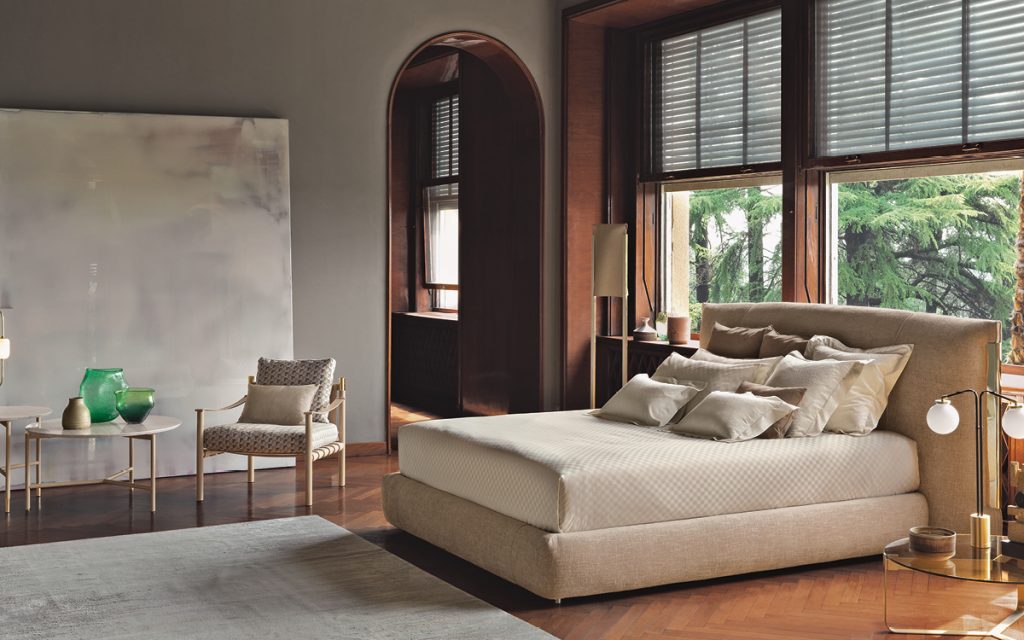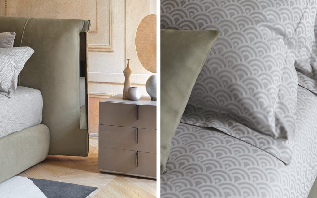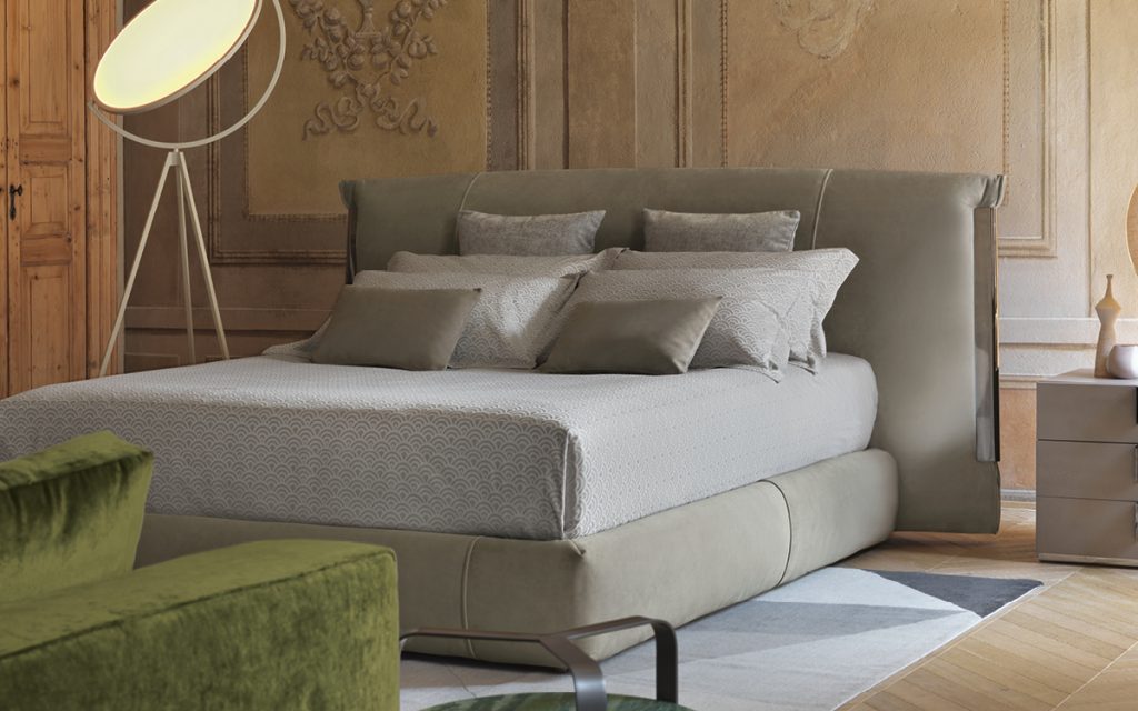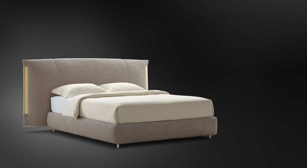 An important double-size bed with class. The bed is embellished with elegant metallic trims. On the sides of the headboard, the trim "anchors" the cover, exalting the softness of the ensemble. The three finishes of the trim (polished gold, matt burnished, polished black nickel) have been devised to match the range of cover materials available. Available with box-spring Leonardo, storage base or base with electrical movements. The covers of the base and the headboard are totally removable and available in fabric, leather or Ecopelle.