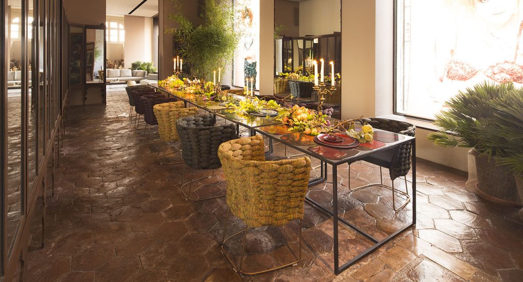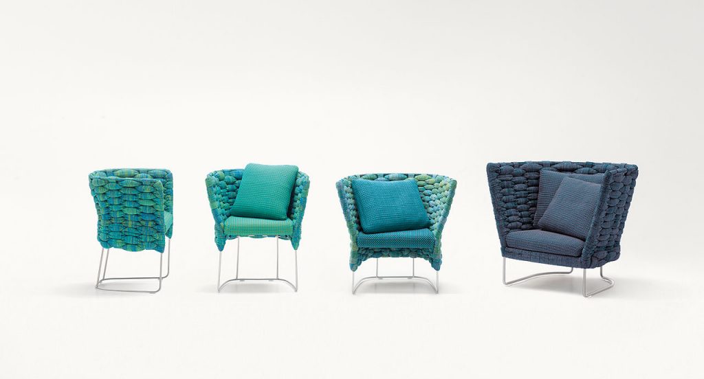 Chair with upholstery hand woven onto the structure. The Ami series also includes a compact armchair, an armchair and sofas available in different dimensions and typologies. - Structure: stainless steel AISI 316. - Structure upholstery: fixed and hand woven with Chain tubular knit. - Base: satin finished or gloss varnished stainless steel AISI 316, Ornué finished stainless steel AISI 304 or Delabré finished brass. Plastic spacers. - Seat cushion: non-removable, in cold injected polyurethane with steel frame with elastic belts; foam covering in polyester fibre and polyamide. - Seat cushions upholstery: non-removable and available in a selection of fabrics in the collection. - Notes: the Délabré and Ornué finishes are made by De Castelli on an exclusivity basis.