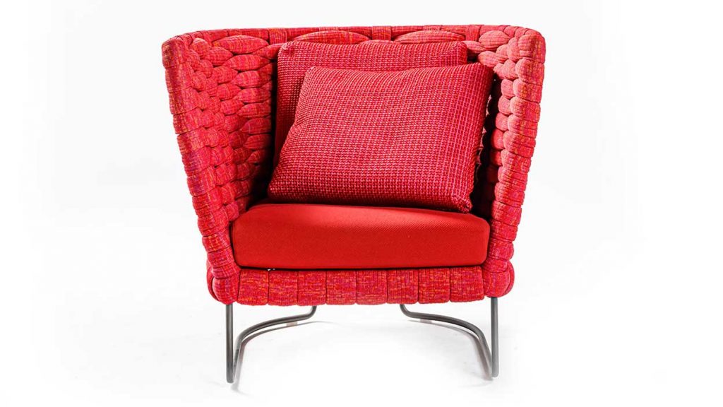 Indoor armchair with a fabric seat shell in red - rosso: peonia - woven directly to the stainless steel tubular structure. Includes two matching throw pillows