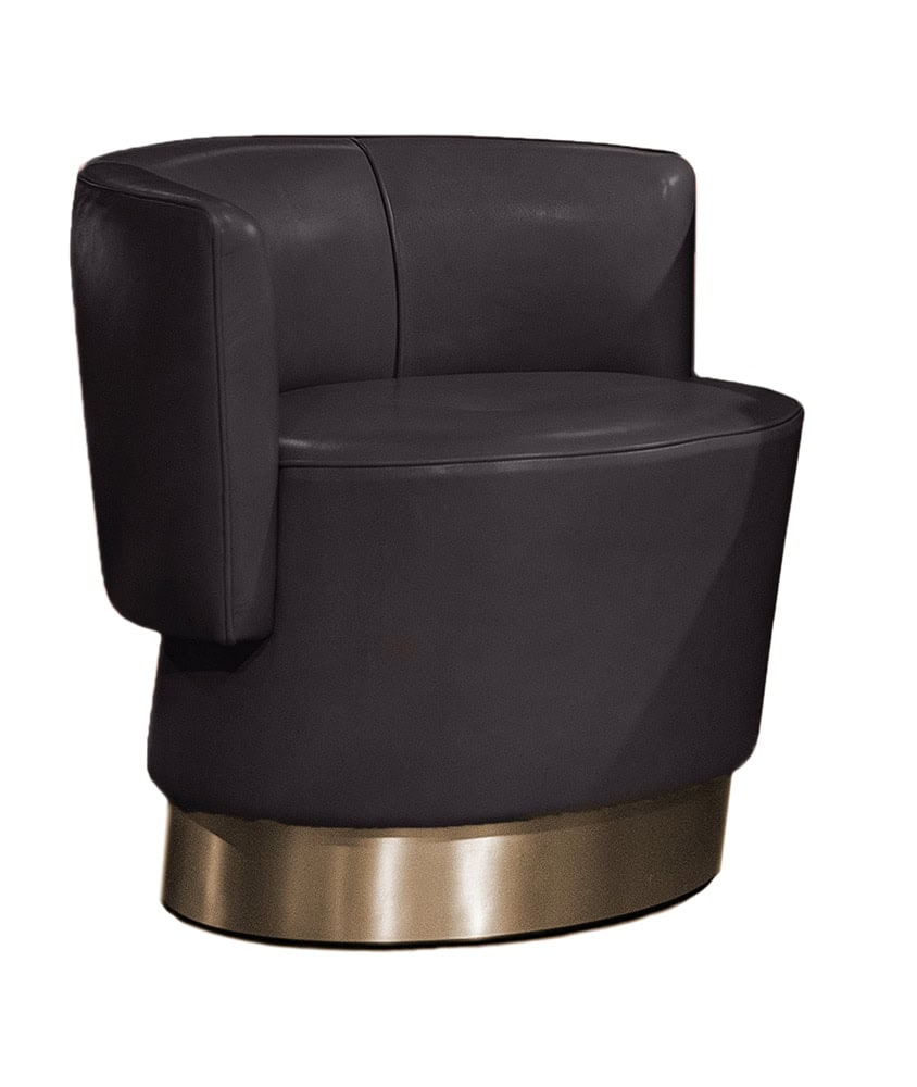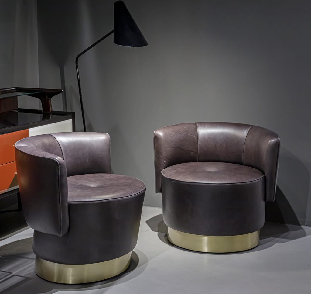 Armchairs upholstered in River Congo leather, with revolving brushed burnished metal base. Sold as a set.