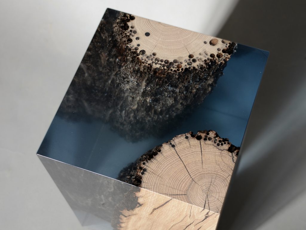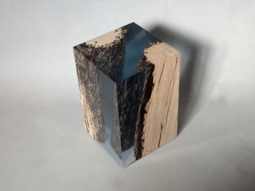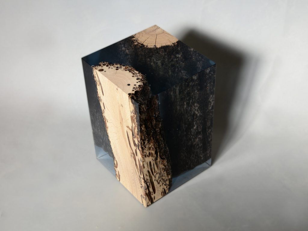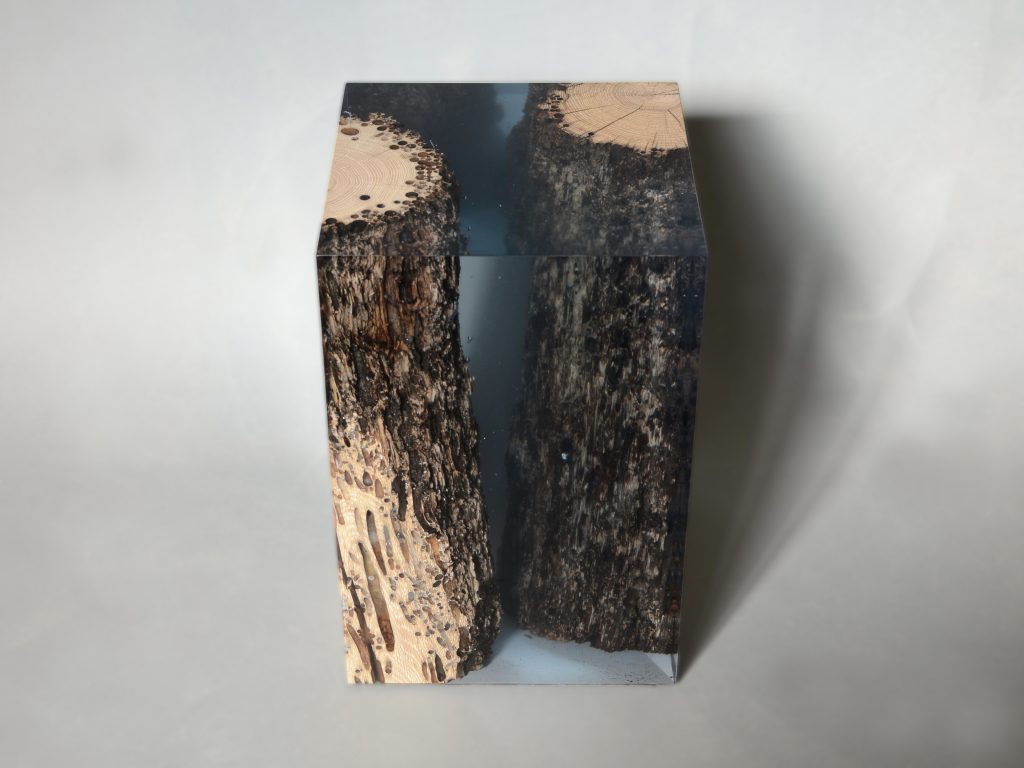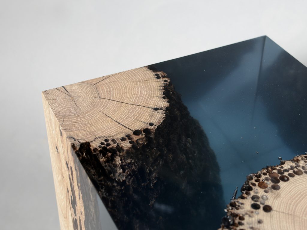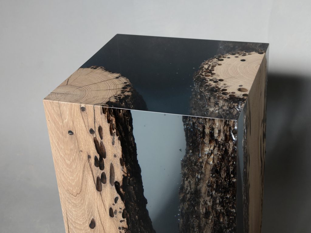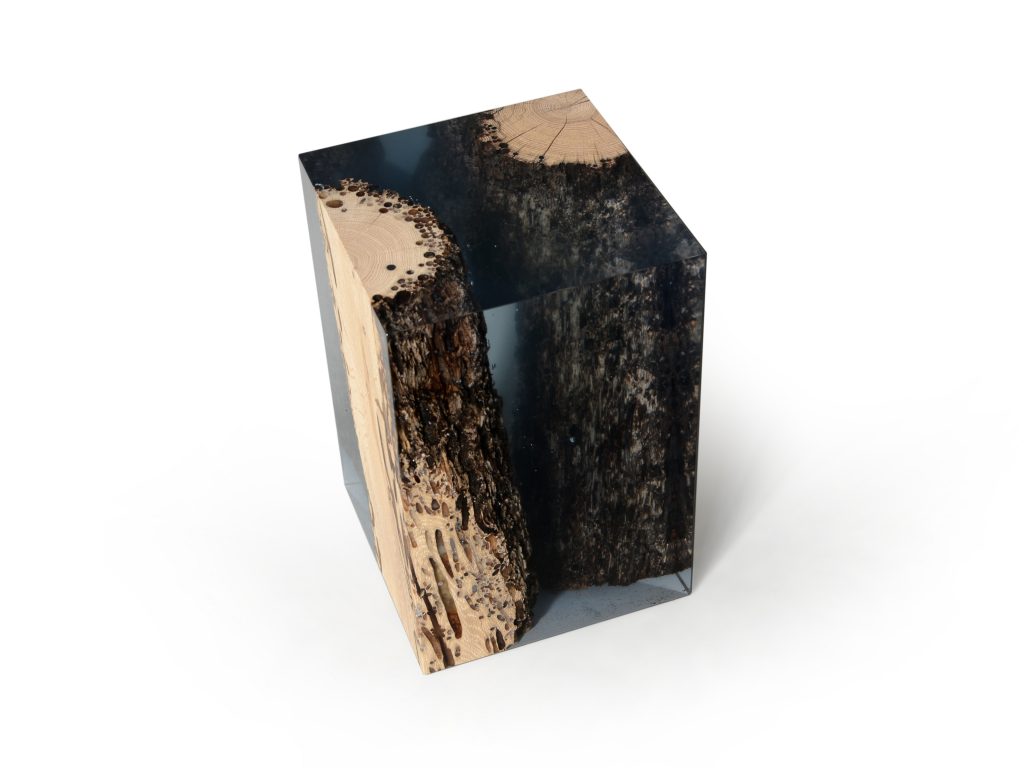According to alcarol's idea of environmental cross-section, the pieces of Bricola Collection re-use and gives new life to Oak poles recovered in the Venice Lagoon. During the years in the canals, these poles are subjected to unremitting labour of lagoon molluscs and atmospheric agents that carve and sculpt the wood, so that each piece is unique. Using a patented and elaborated resination process, alcarol preserves intact the natural and peculiar live edges, filling the gaps and capturing the underwater air bubbles that bring the wood back to the original look and conditions. At the same time, the natural wood surface on the section planes is not not covered by resin, in order to guarantee a different experience of touch and sight, and to give their essential characteristics: warmth and matt porosity from natural wood, elegance and evocative transparency from the resin.