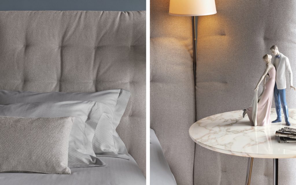 Double-size bed with impressive lines, available in the versions with simple headboard or with side panels. Padded and quilted headboard with completely removable covers in fabric or leather. Available with box-spring base Leonardo, fixed base h 25 cm, storage base or base with electrical movements. Two lamps Angle with a polished chrome-plated, golden or bronze tubular structure can be installed in the intersection recess between the headboard and the panels of Angle bed.