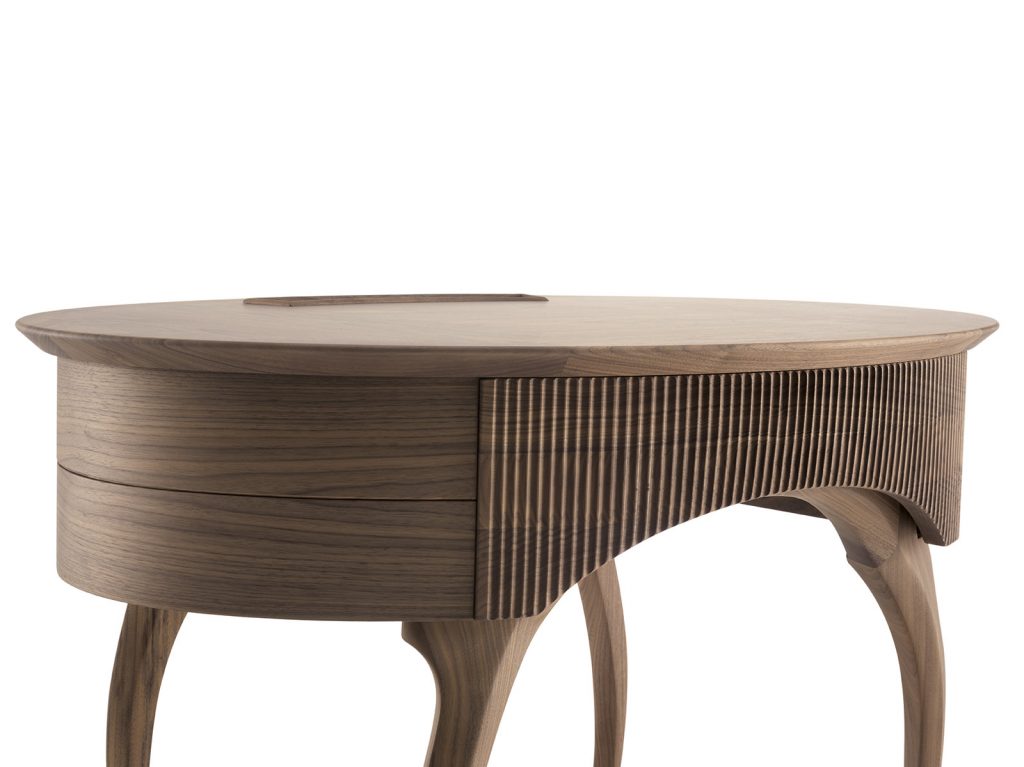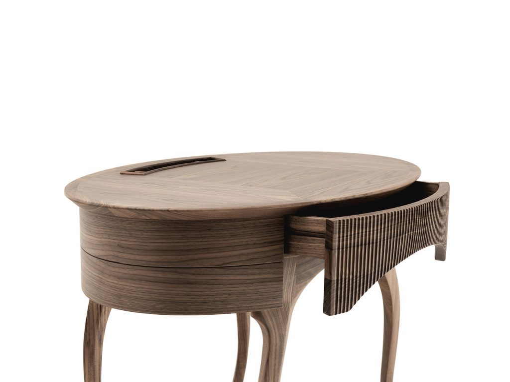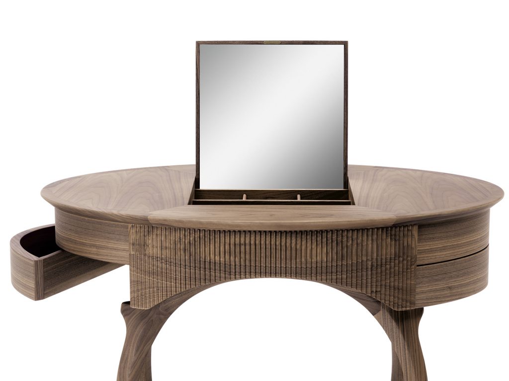 Small writing desk made in solid american walnut and veneered plywood, central drawer and swivel side drawers. Arabella toilette : made in solid american walnut and veneered plywood, central flip-up top with mirror, internal wooden partitions, swivel side drawers, available with battery charged led light under flip-up top.