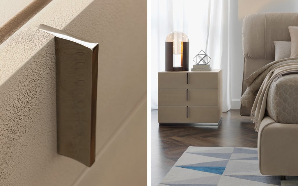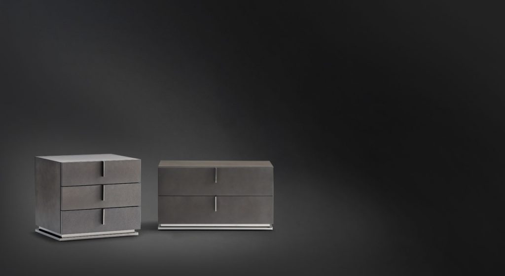 These are the accessory units in the Ari series; the wooden structure of the night table and the tallboy has been embellished by a matt lacquered 'galuchat' effect finish, available in two colors: Deserto and Laguna.