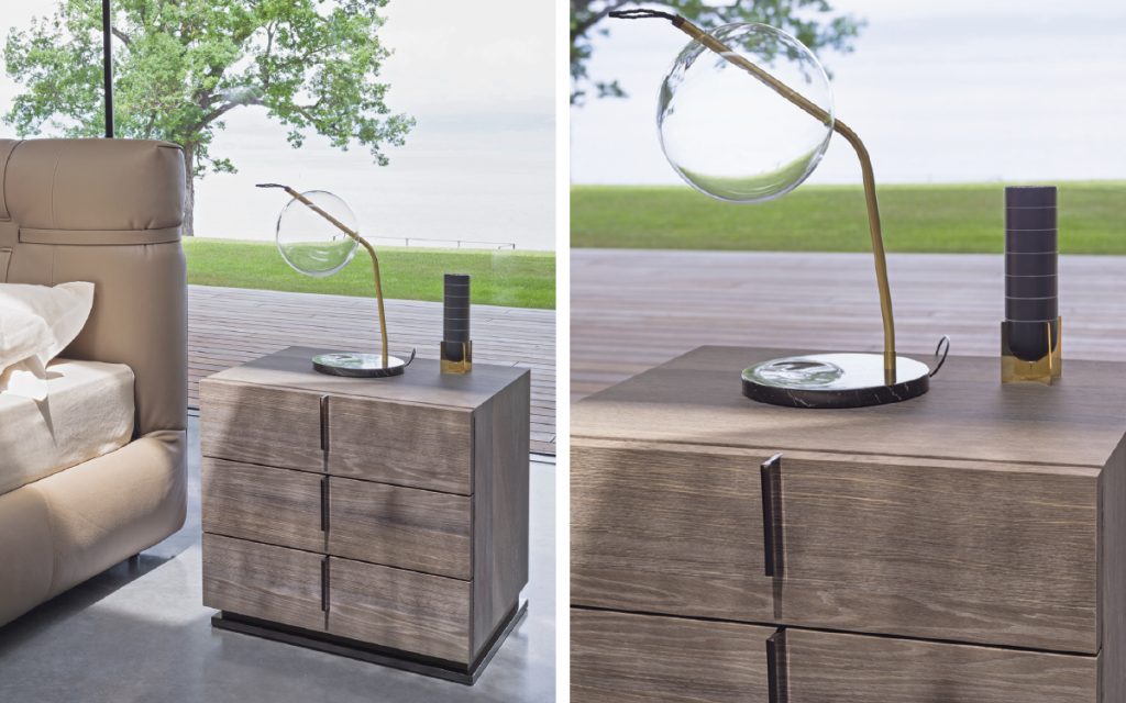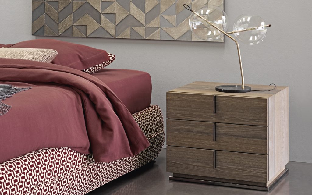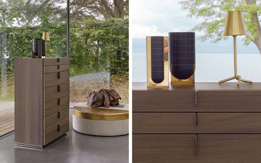 Precious version in fossil wood for the three-drawer nightstand and tallboy.