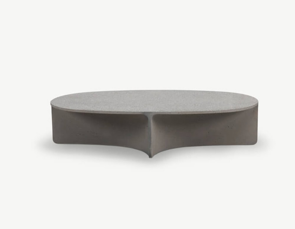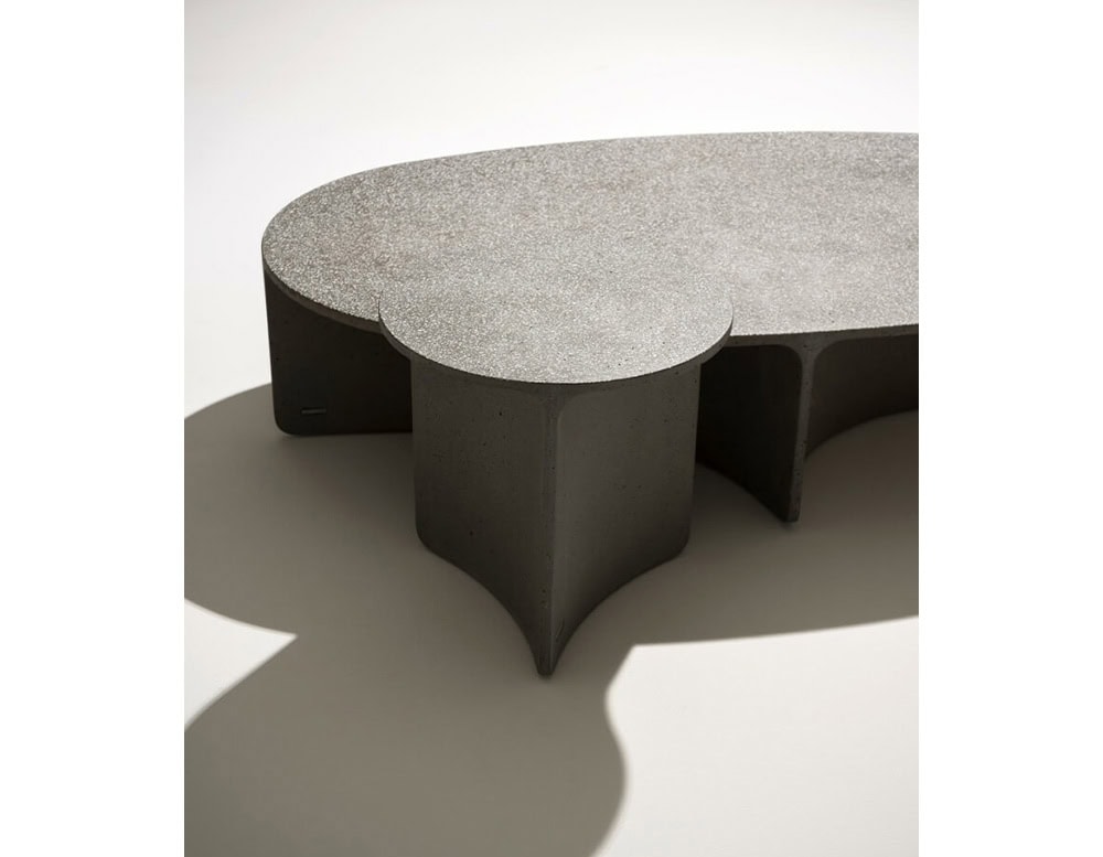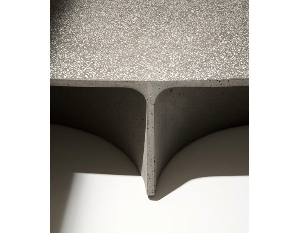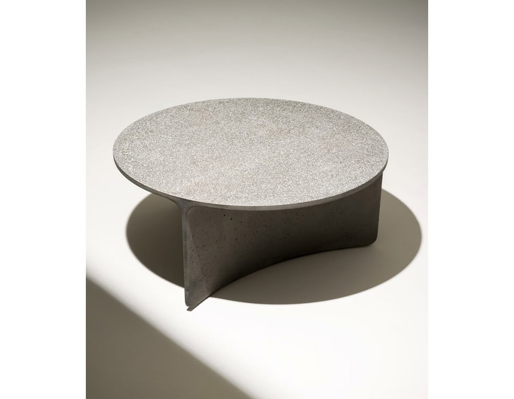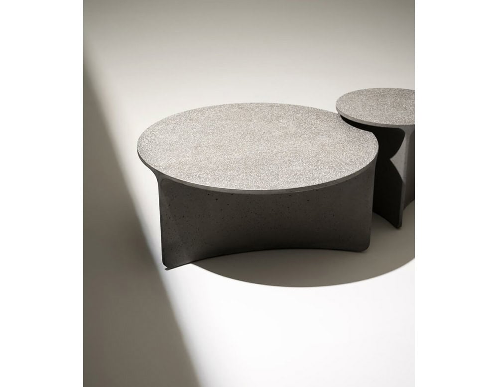 ASPIC includes three extremely versatile tables, two with round tops in different sizes and the other one in a larger oval version, whose concrete structure gives a sense of stability and durability in sharp contrast to the visual elegance of the tops and the concave lines of the base.