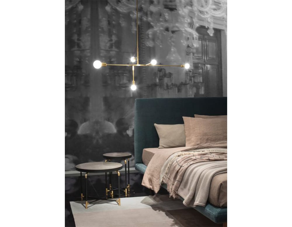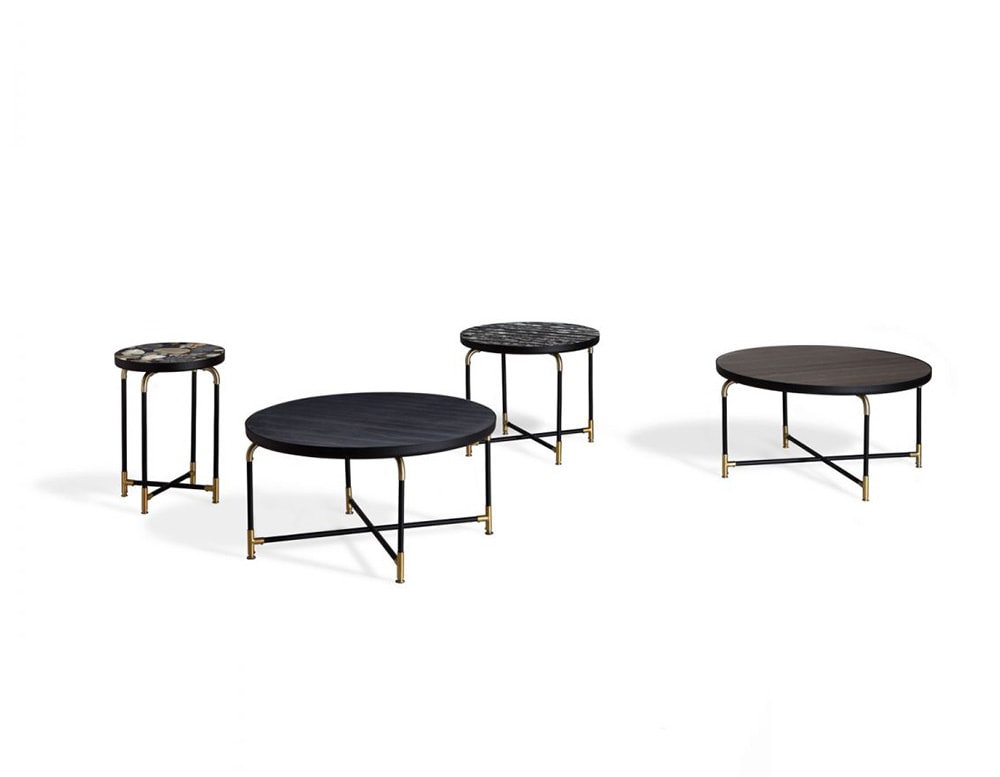 A set of small tables with an original, sophisticated design. Their thin, essential frame is embellished by gilded finish. You can choose from different kindsof tabletops - precious inlaid Canaletto walnut, full-grain leather and marbles from the Ivano Redaelli Collection according to the style you wish to create.