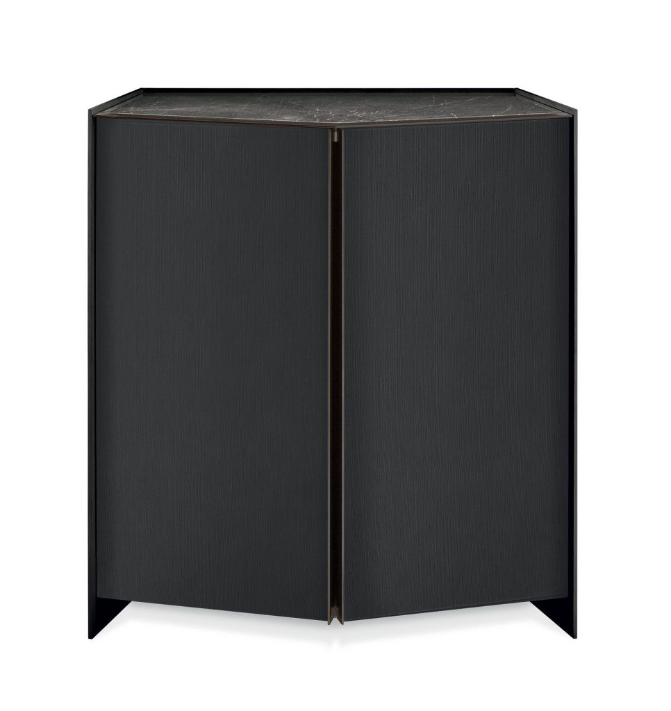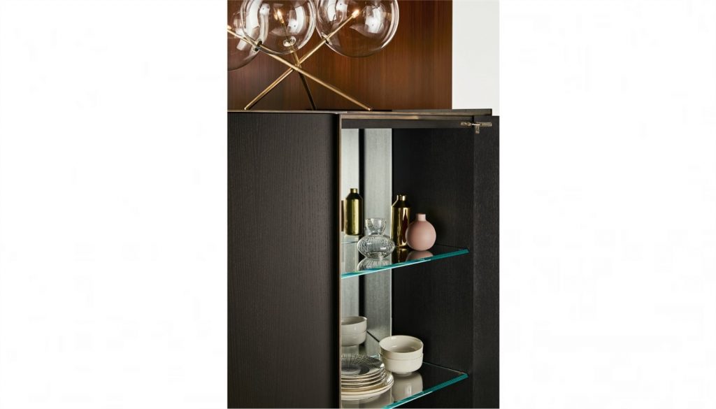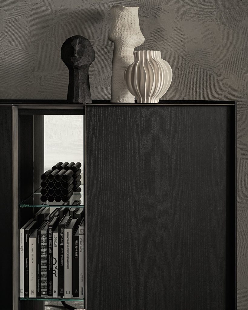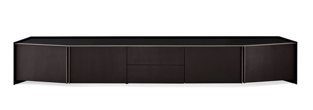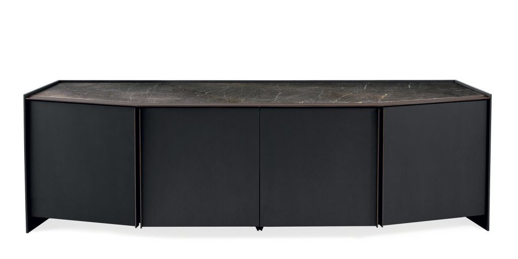 Sideboard in black open pore lacquered ash. Patinated bronze lacquered metal details. Bright black painted glass top. Available also in Grey Stardust or Sahara Noir marble top. Supplied with 10mm tempered extralight inside glass shelf. Push-pull drawers with suede bottom.