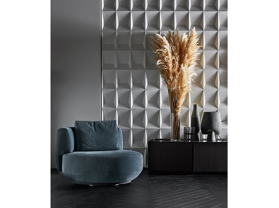 Swivel armchair in nondeformable foam polyurethane in different densities and polyester fibre with wooden inside structure. A polyester fibre back cushion included. Available covered by fabric or leather as per sample. Decorative polyester fibre cushion, on request.