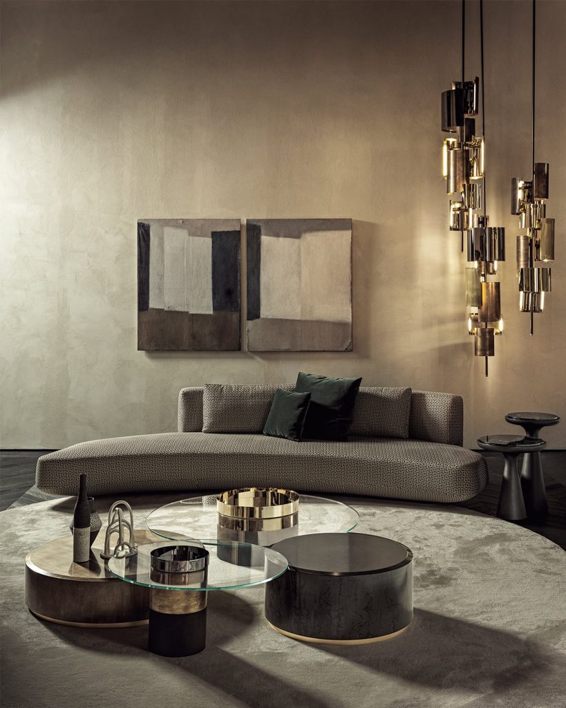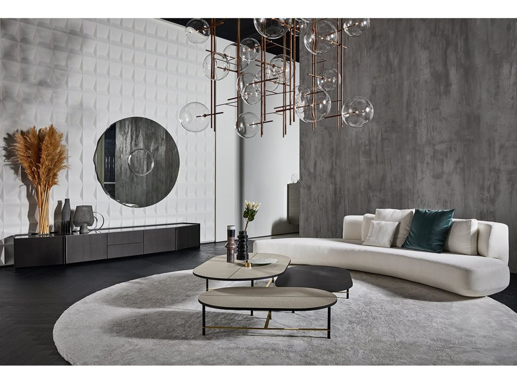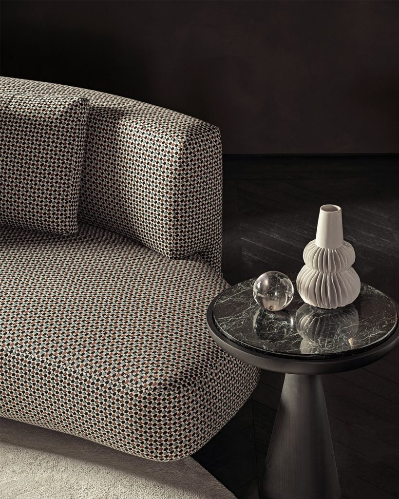 Sofa in non-deformable foam polyurethane in different density and polyester fibre with wooden inside structure. Black lacquered wooden feet. Available covered by fabric or leather. Decorative polyester fibre cushions, on request.