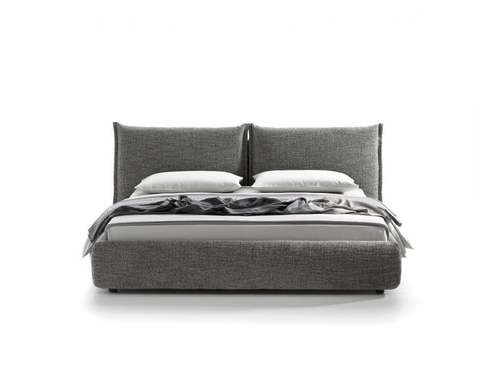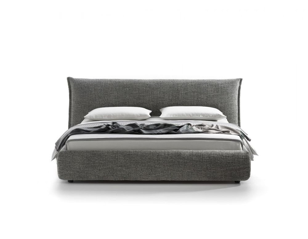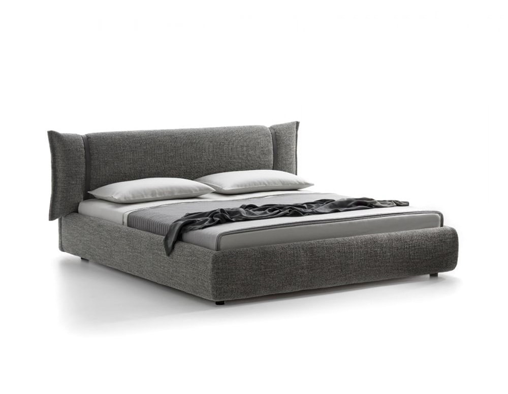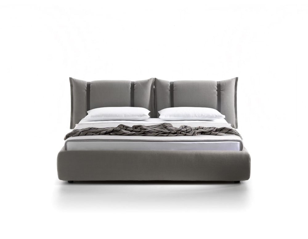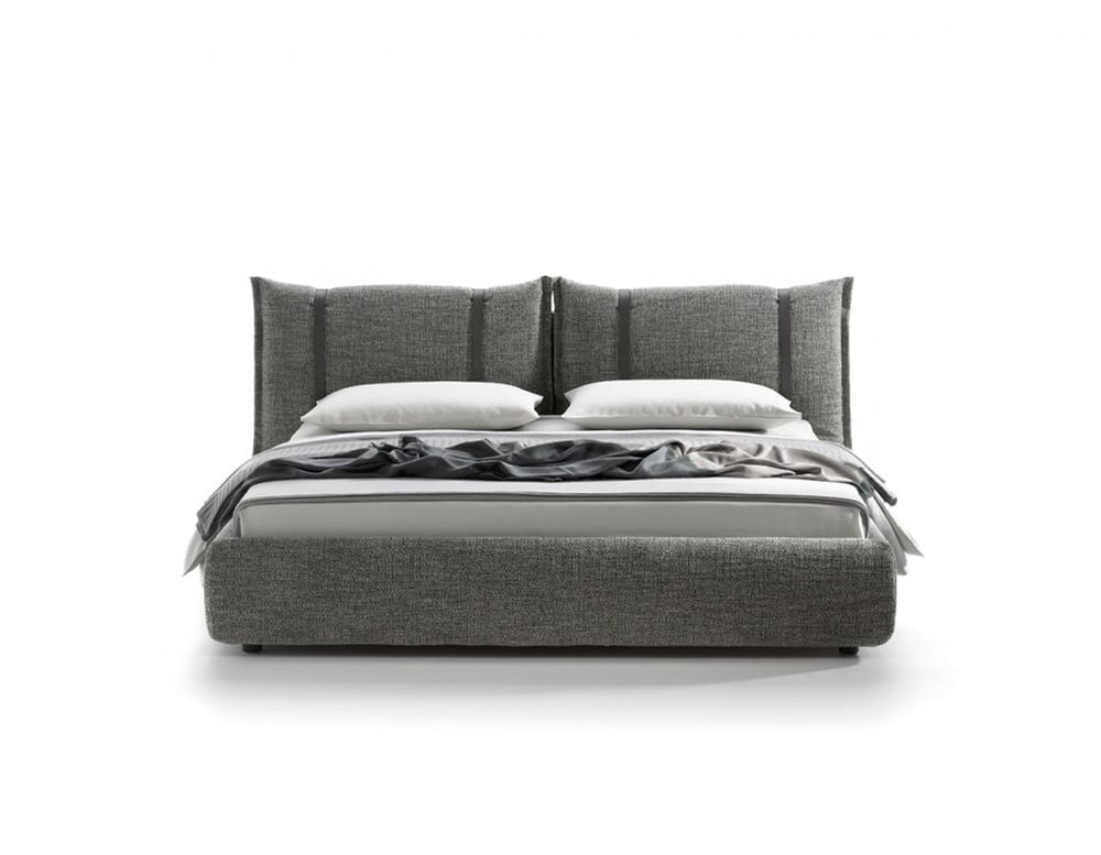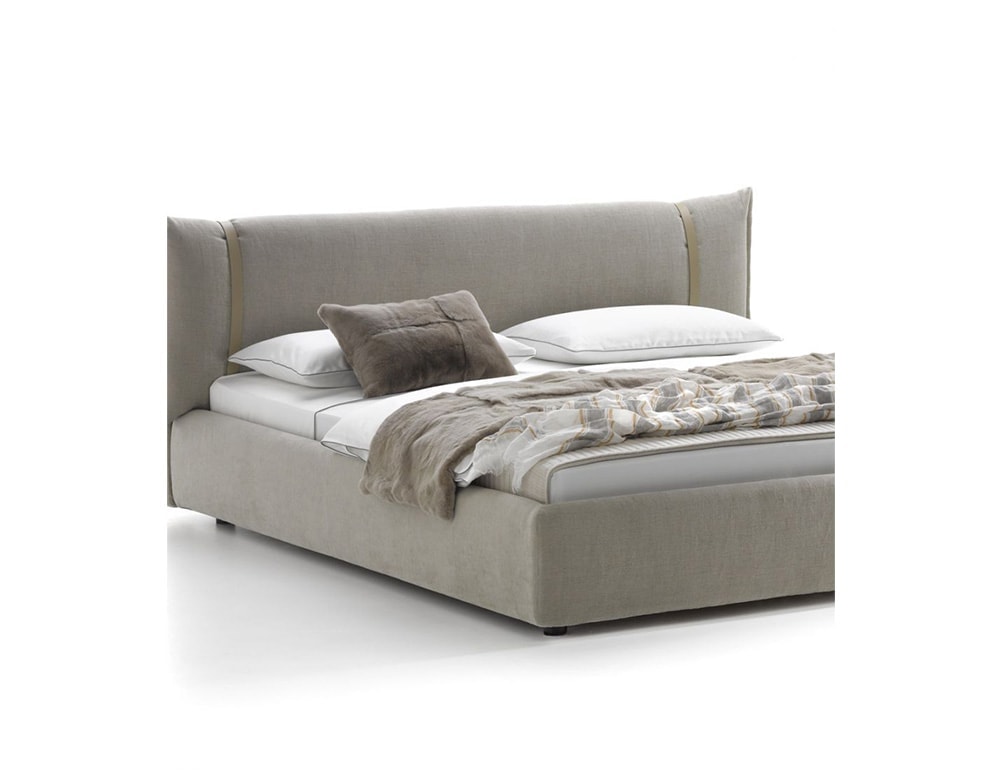 Big, soft cushions inviting to relax and rest build the head of this bed, delicately leaning on the backrest and embellished by its peculiar edge stitching. Notice the leather straps detail, fastened to the bed just like a belt of a clothing item that can be added to the beds basic composition. The soft, enveloping bedframe is wholly covered in fabric.
