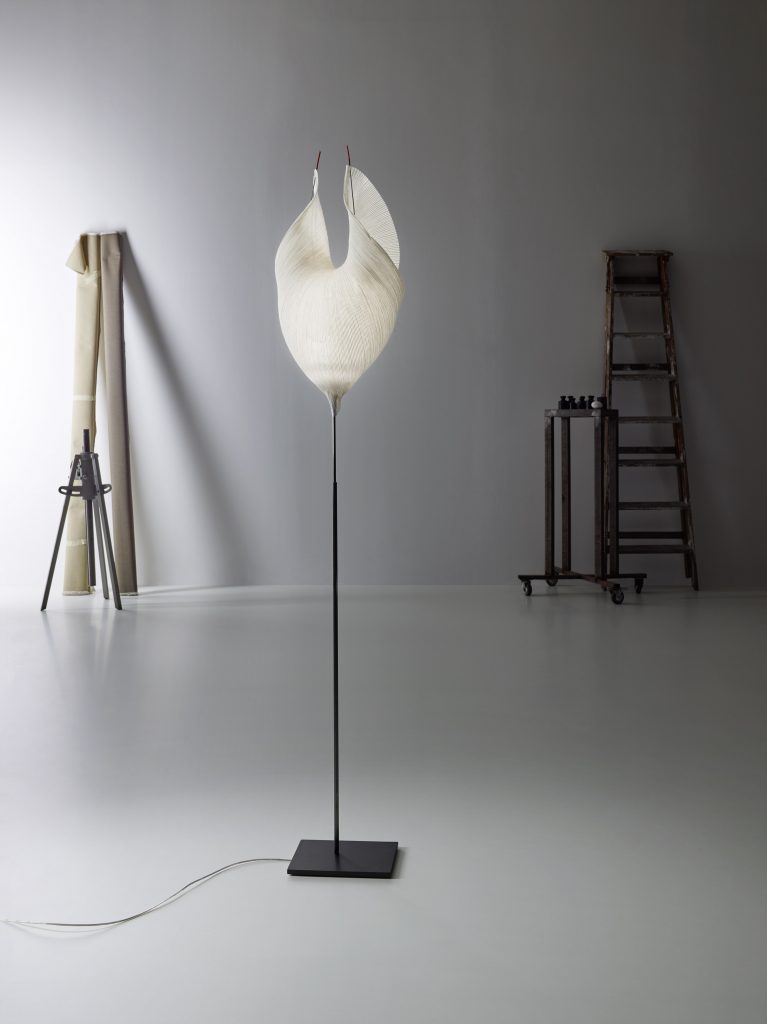 Paper, metal, stainless steel, silicone. Babadul is both a floor lamp and a light object, which emanates positively and unmistakably on spaces. The paper sheet hovers at the end of a slender metal rod, like a large abstracted flower petal. Just as in all other MaMo Nouchies, the lampshade consists of Japanese paper, which has to undergo a special manufacturing process in Dagmar Mombachs studio, until the desired shape is achieved. The light source is an LED module, provided with a cooling element, developed by Ingo Maurer especially for the MaMa Nouchies. Its light is so warm and soft, that any difference can hardly be noticed when compared to conventional halogen light sources.