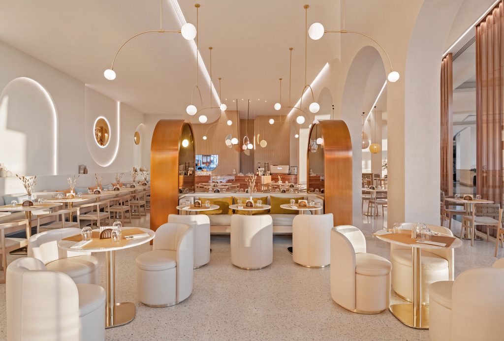 A minimal, sculptural suspended light composed of a larger lit 7" sphere on a short horizontal stem opposite a smaller lit 4.5" sphere on a longer, downward arcing stem.