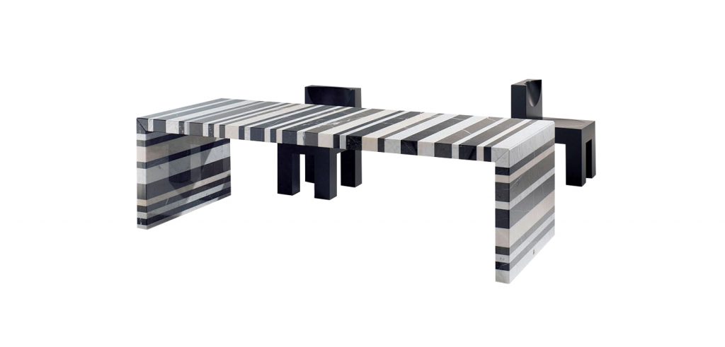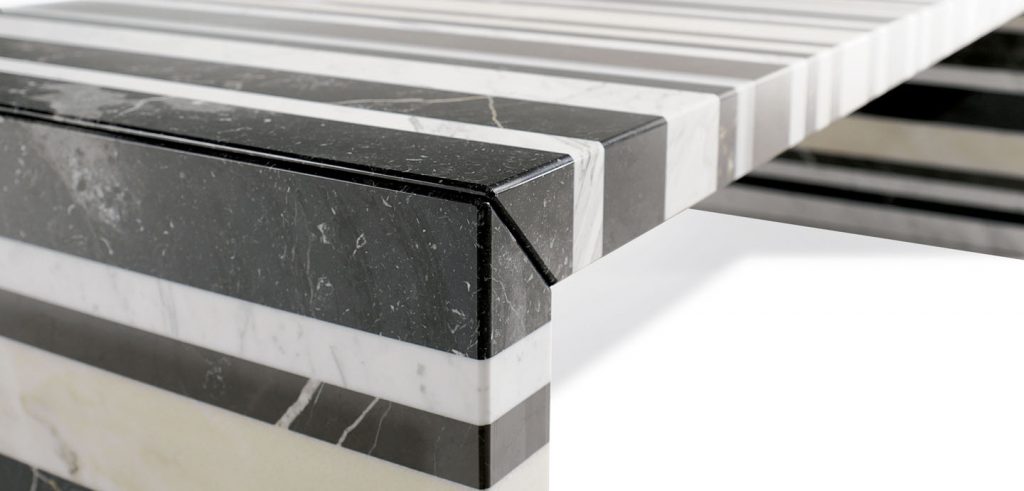 The Barcode Table is a dining table and also a conference table. It can be recycled by 100 % due to its basic materials stone and steel. The concept of sustainability is the basis of this design as the stones from the production process are used as resource. Every Barcode Table is unique. The table top can be supplied in many different combinations. Naturally, the individual selection of the stone types is limited and availability must be checked by enquiry.